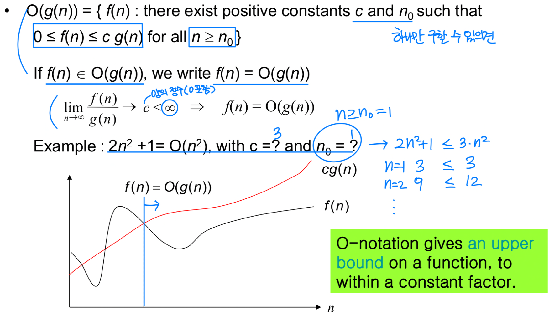 Big-O 표기법은 함수의 점근적 상한을 나타낸다. 이라 함은, 충분히 큰 에 대해 이 을 넘지 않는 양의 상수 와 가 존재한다는 뜻이다.