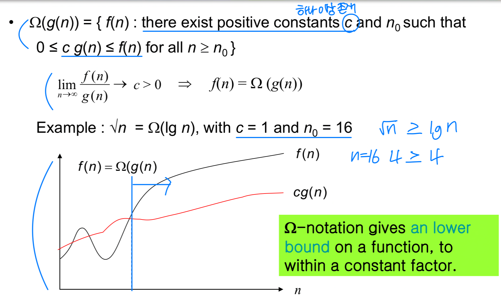 "최소한 이 정도의 시간은 걸린다"라는 의미로, 알고리즘의 최선 성능의 하한선을 제시한다.
