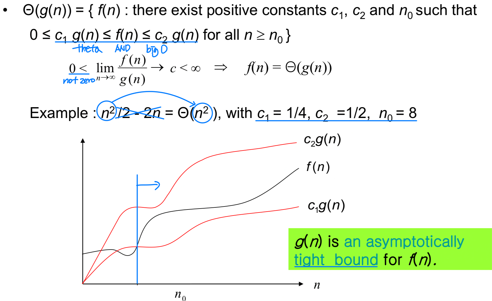 Big-Theta 표기법은 함수의 점근적 정확한 한계를 나타낸다. 이라 함은, 이면서 동시에 인 경우다.