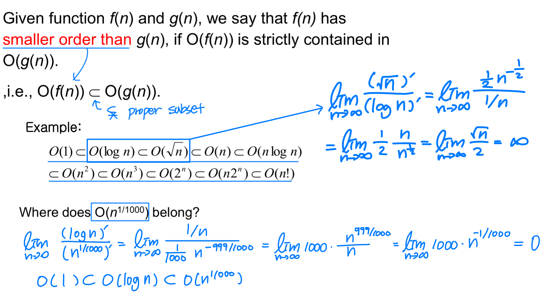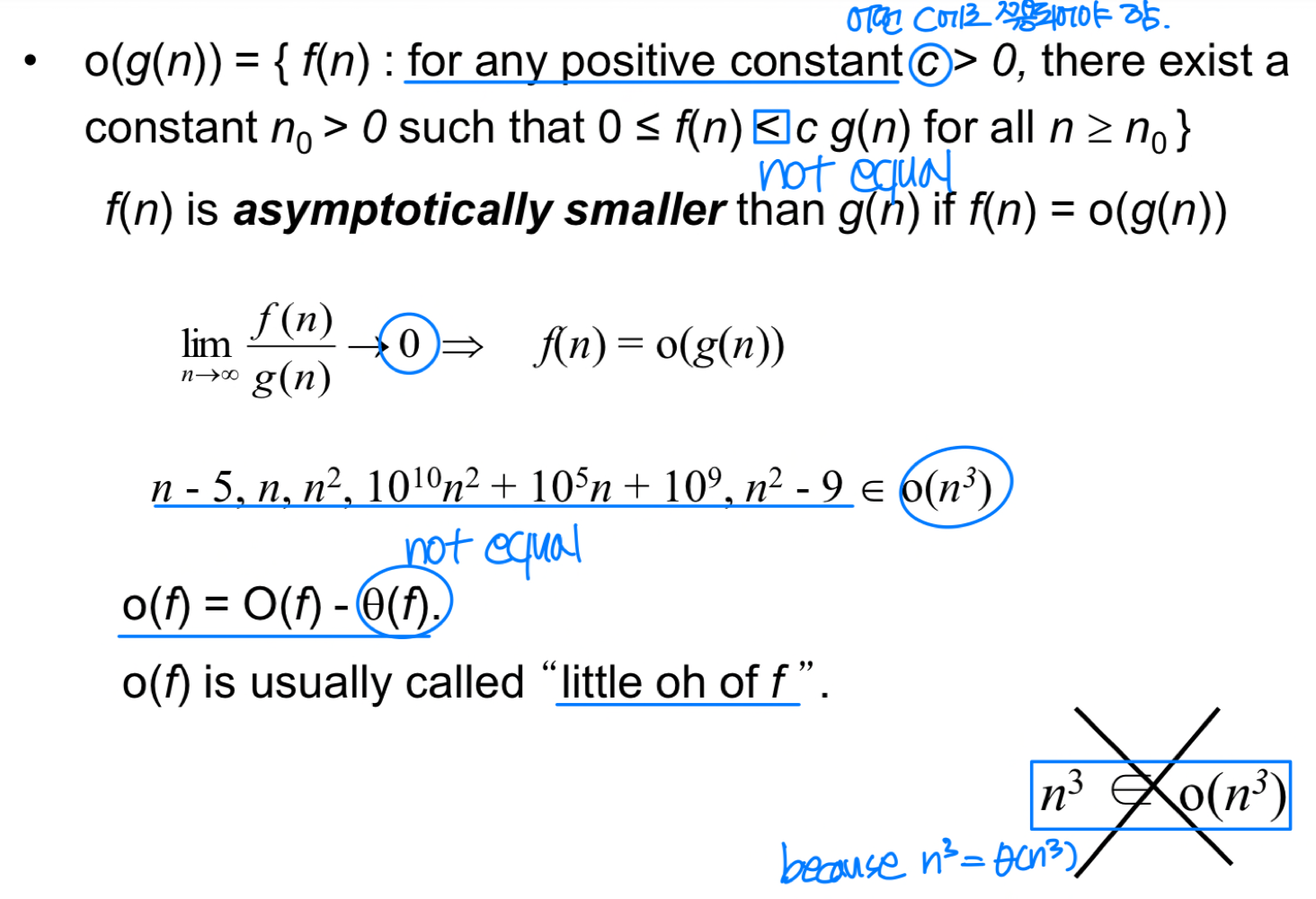 Big-O에서는 "같거나 느리다"(≤)이고, Little-o에서는 "확실히 느리다"(<)이다. 예를 들어 은 참이지만, 은 거짓이다.