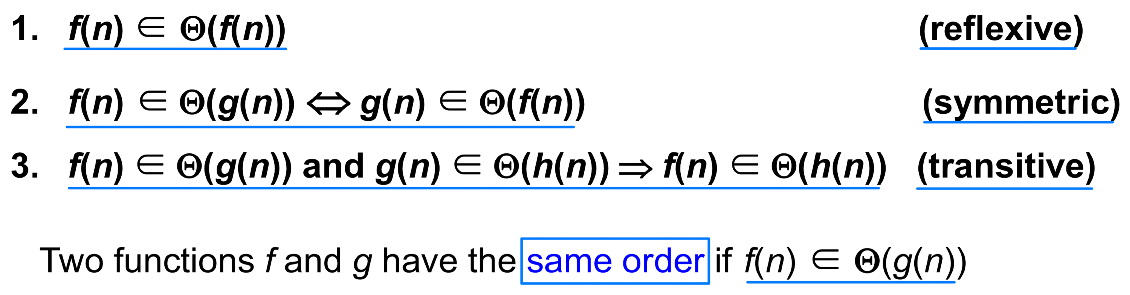 상한과 하한이 같은 차수이므로 "정확히 이 정도 수준으로 증가한다"라는 가장 정밀한 표현이다. 세 표기법 중 가장 많은 정보를 담고 있다.