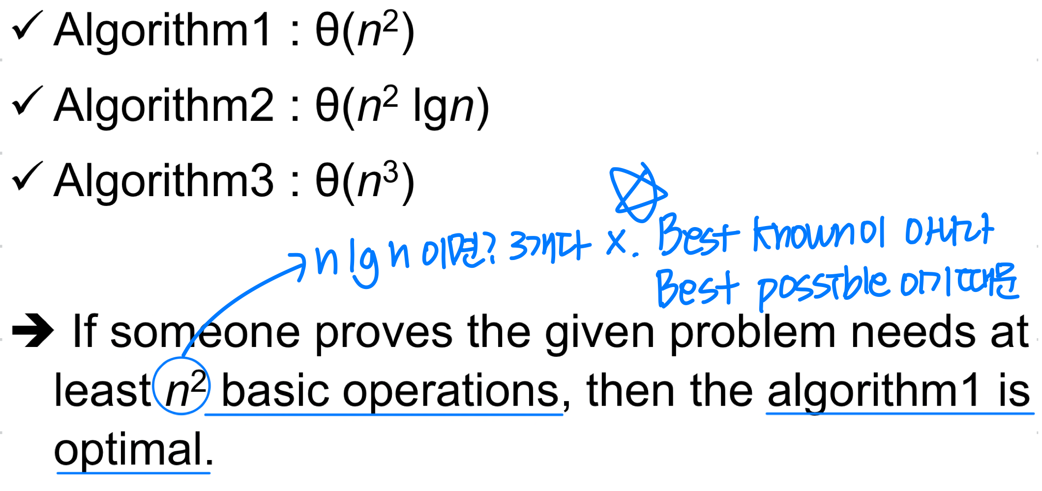 여기서 주의할 점이 있다. "최적"이란 "현재 알려진 것 중 최고(the best known)"가 아니라 "이론적으로 가능한 최고(the best possible)"를 의미한다. 아무리 기발한 알고리즘을 고안하더라도 문제의 하한보다 더 빠른 알고리즘은 존재할 수 없다.
