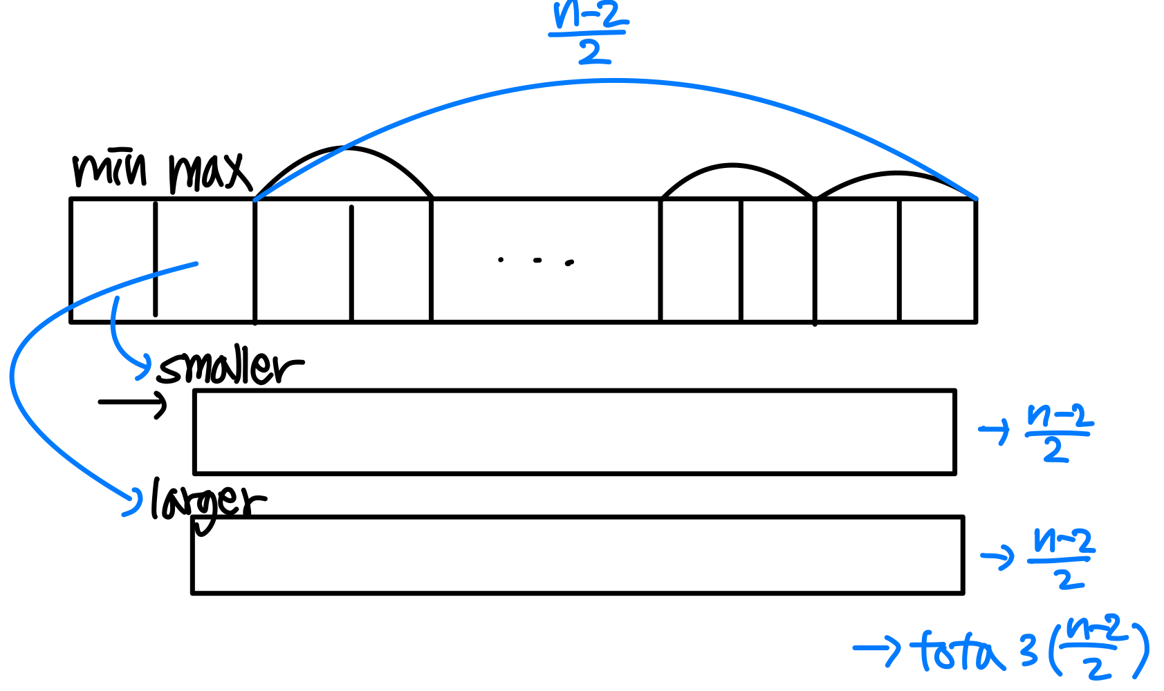 n이 짝수인 경우: 처음 두 원소를 비교하여 큰 값을 max, 작은 값을 min으로 초기화한다. 이후 나머지 원소를 쌍으로 처리하면, 1 + 3(n-2)/2 = 3n/2 - 2번 비교로 충분하다.
