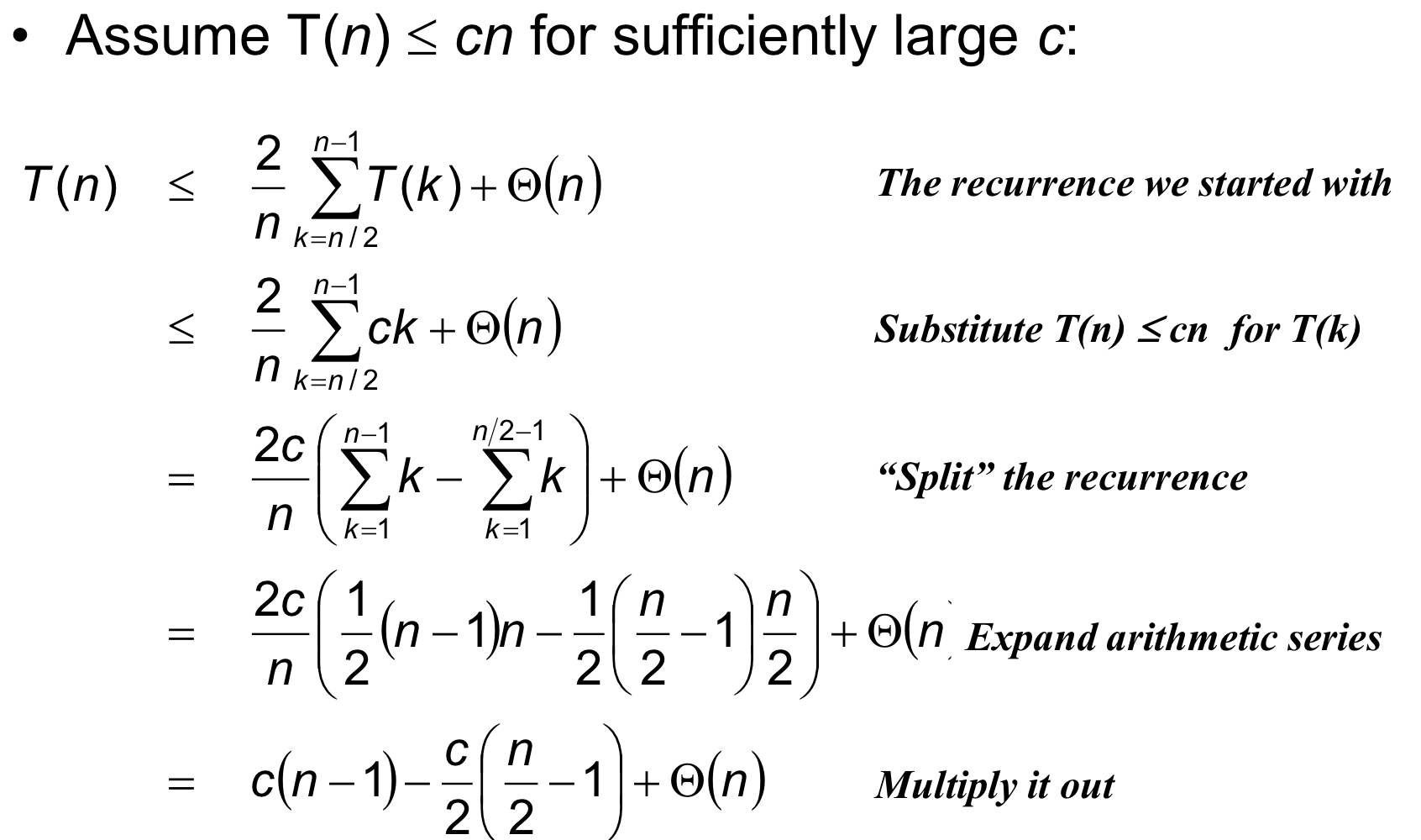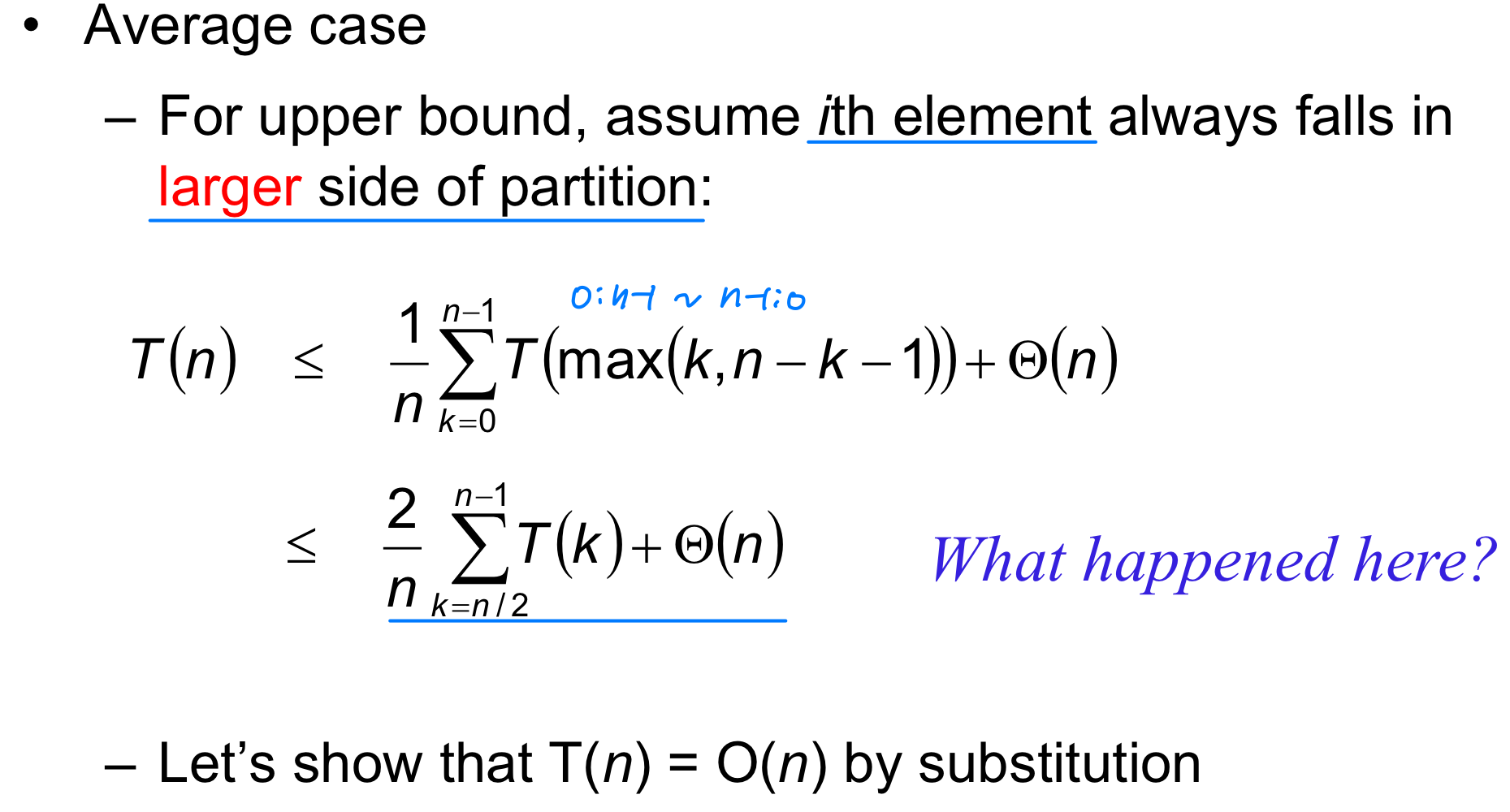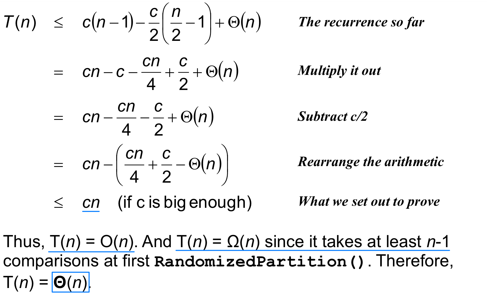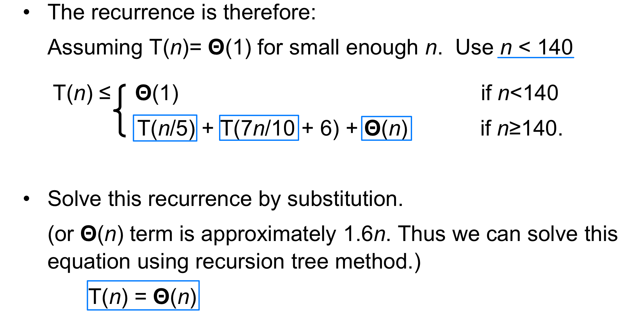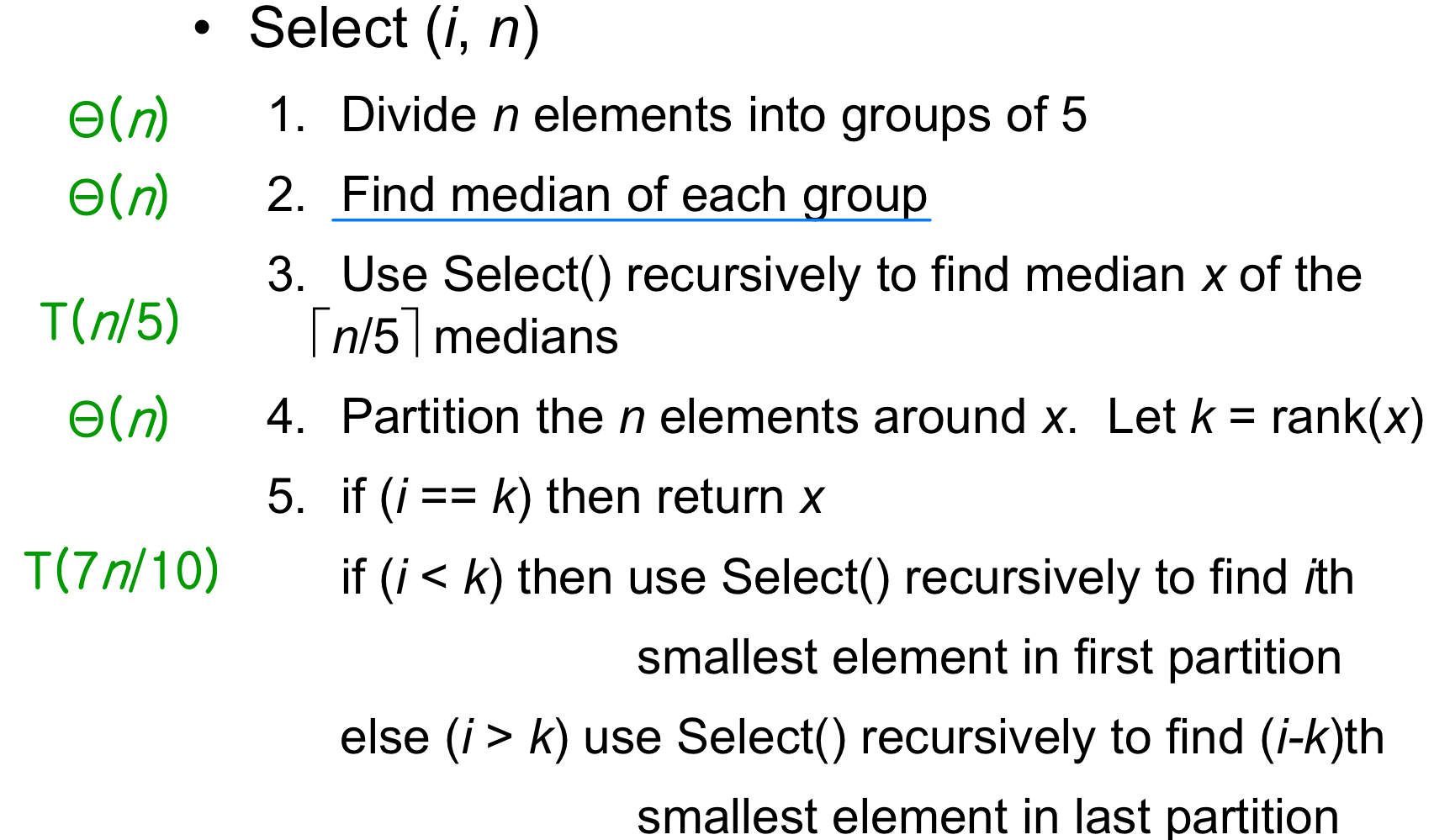 점화식을 풀면 이 된다. 최악의 경우에도 선형 시간을 보장하지만, 숨겨진 상수 계수가 커서 Randomized Select보다 실제 성능은 떨어진다. 그래서 실무에서는 Randomized Select를, 이론적 보장이 필요할 때만 이 알고리즘을 사용한다.