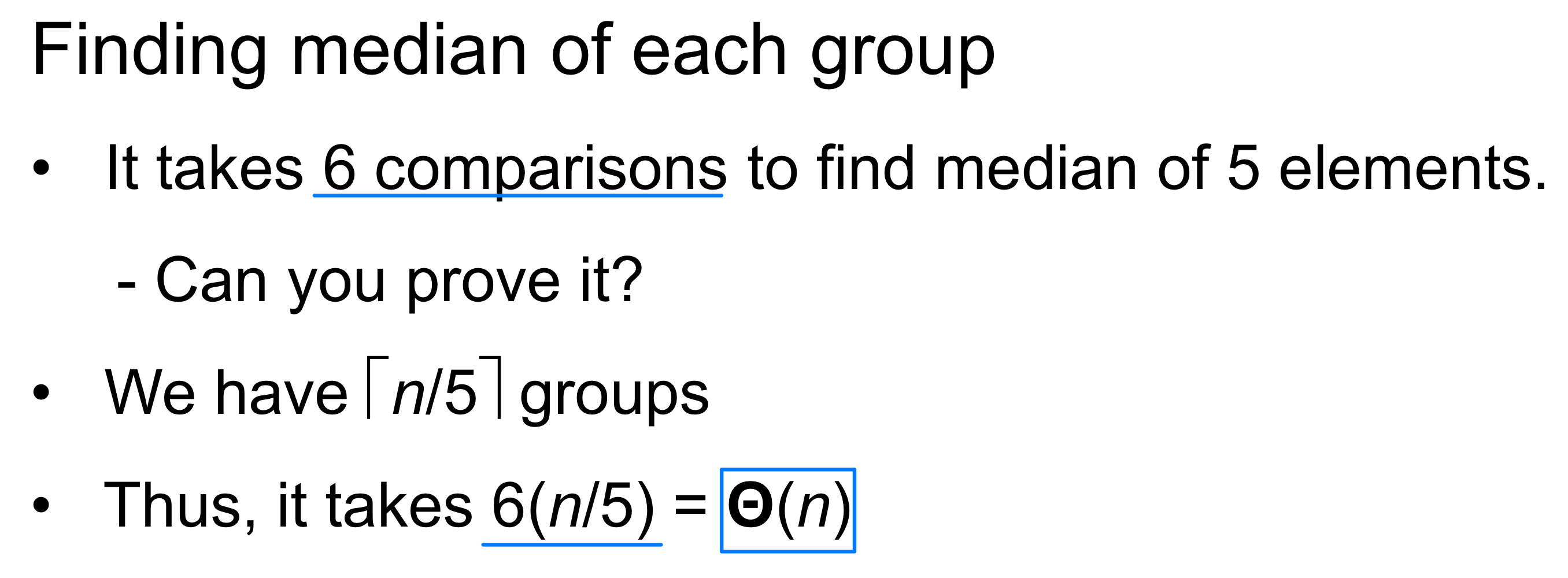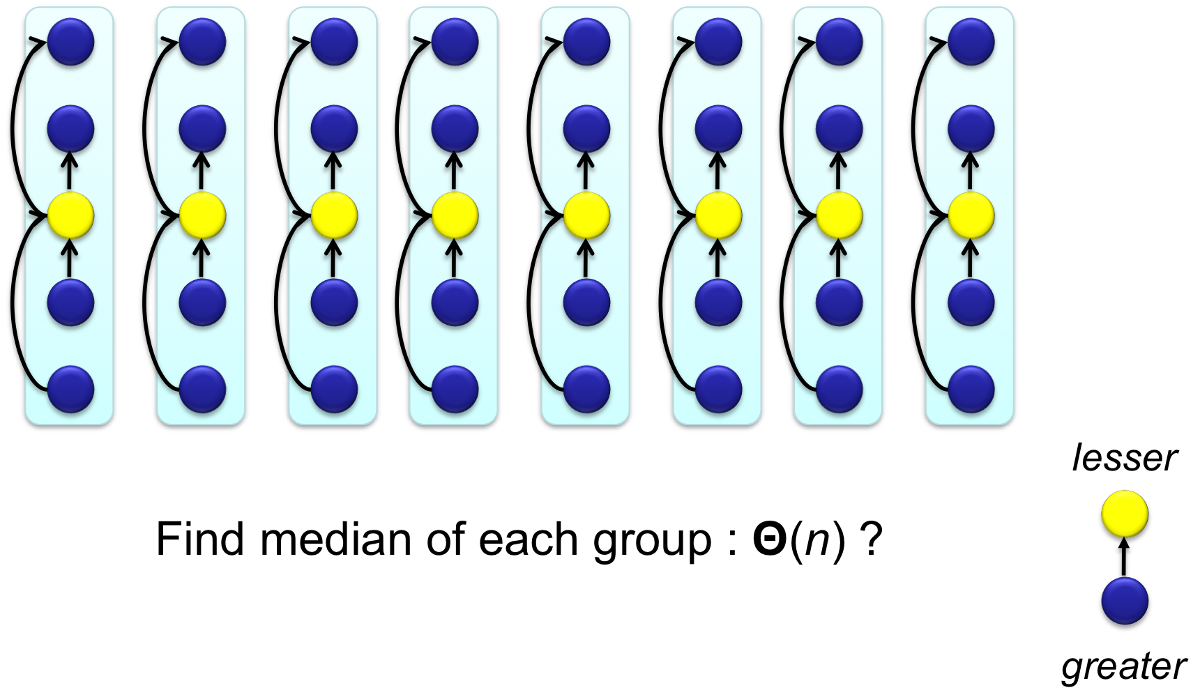 Step 2. 각 그룹을 정렬하여 중앙값(Median) 을 구한다. 5개 원소의 정렬은 상수 시간이므로, 전체적으로 시간이 걸린다.