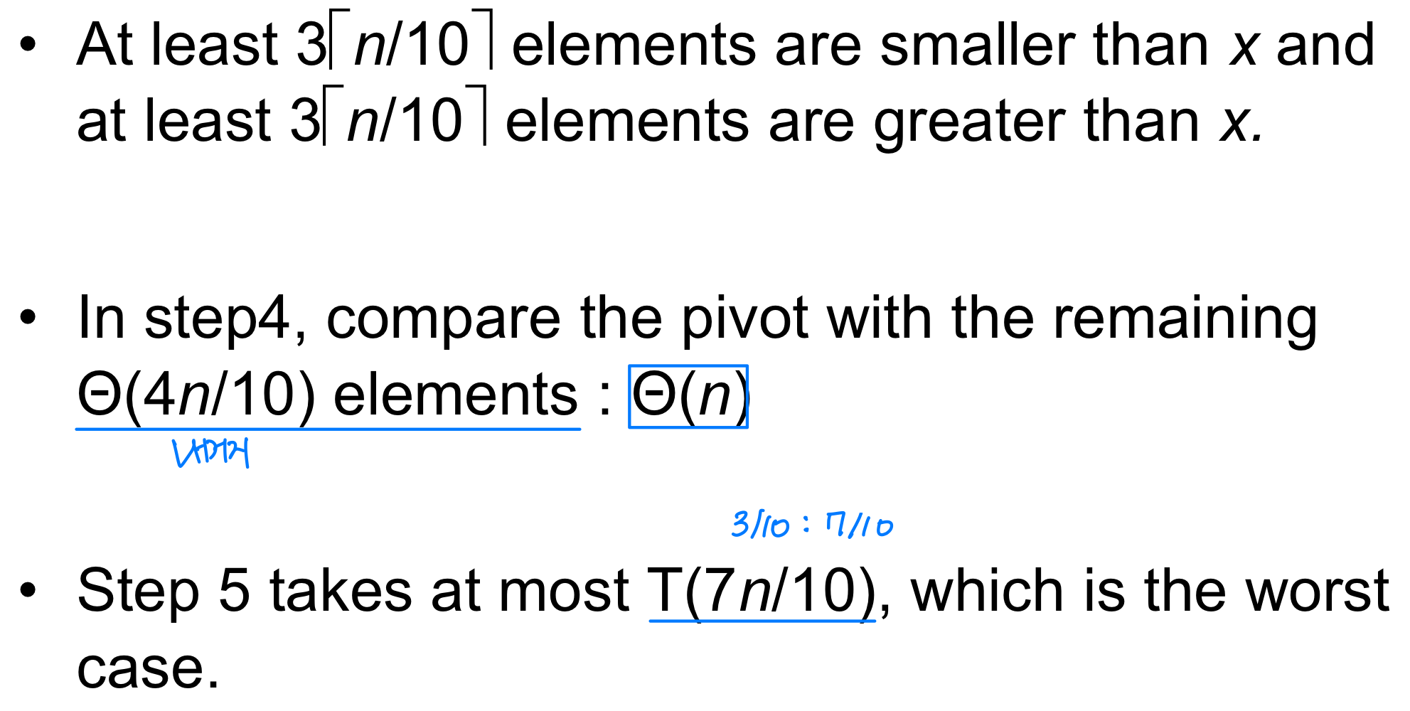 Step 4. x를 피벗으로 partition한 뒤, Randomized Select와 동일한 방식으로 재귀한다.