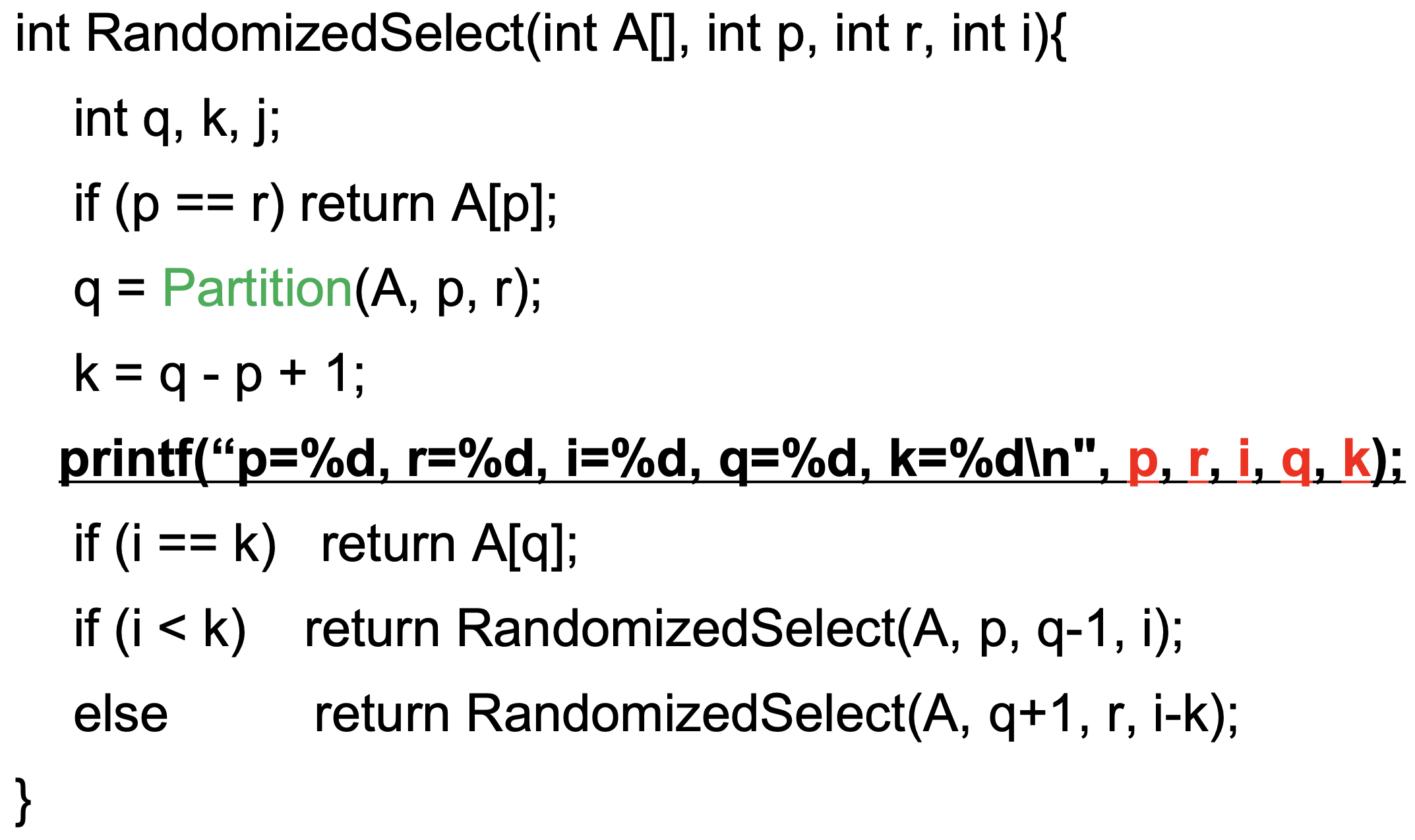 배열 A[p..r]을 partition하면 피벗 A[q]를 기준으로 두 부분 배열 A[p..q-1]과 A[q+1..r]이 만들어진다. 피벗이 p번째부터 세었을 때 k번째라 하면: