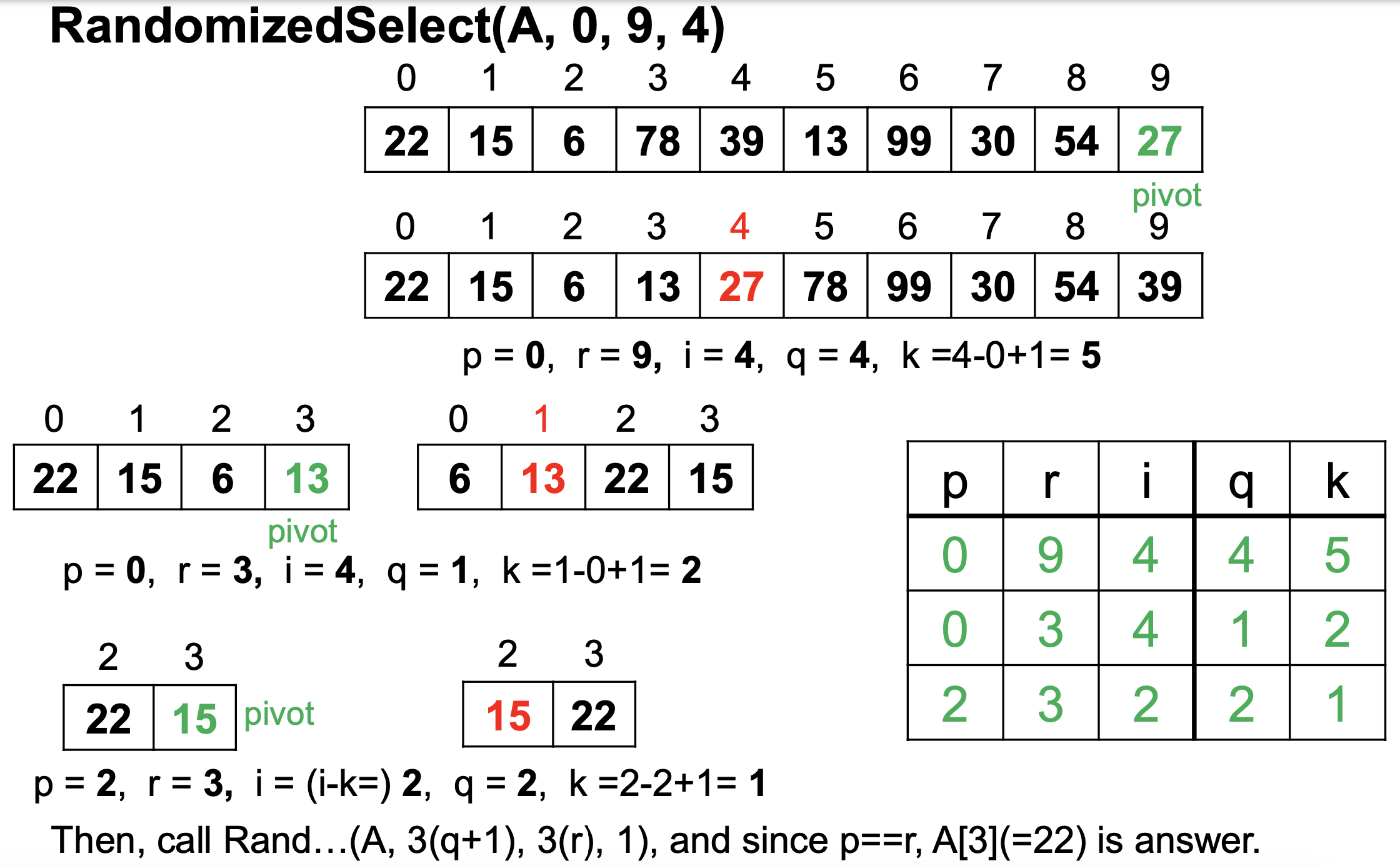 - i = k 이면: A[q]가 바로 답이다. 반환한다.