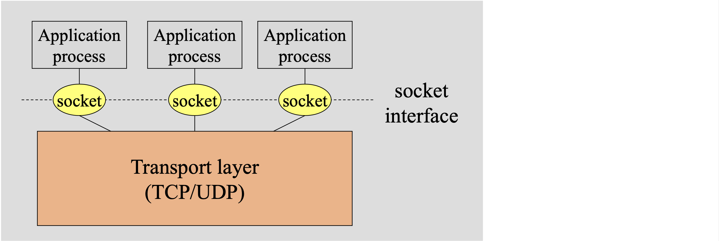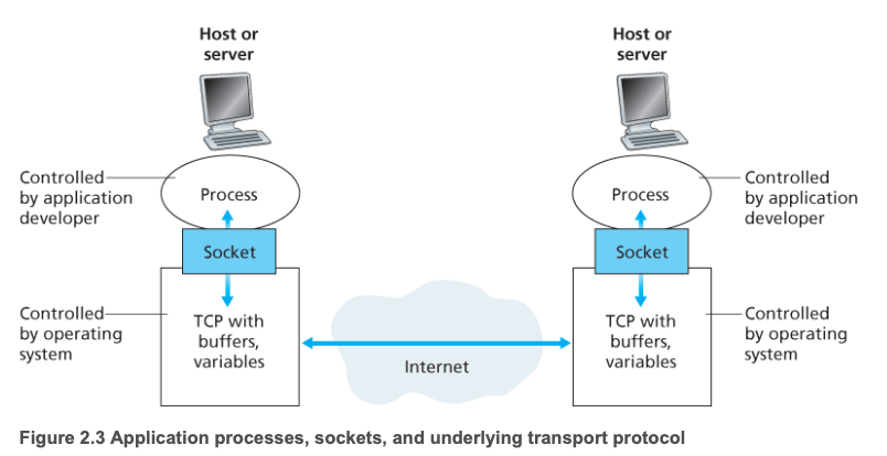 소켓은 호스트의 애플리케이션 계층과 트랜스포트 계층 간의 인터페이스이므로, 애플리케이션과 네트워크 사이의 API라고도 한다. 애플리케이션 개발자는 소켓의 애플리케이션 계층에 대한 모든 통제권을 갖지만, 트랜스포트 계층에 대한 통제권은 거의 갖지 못한다. 개발자가 할 수 있는 것은 트랜스포트 프로토콜 선택과, 최대 버퍼/최대 세그먼트 크기 같은 약간의 매개변수 설정 정도이다.
