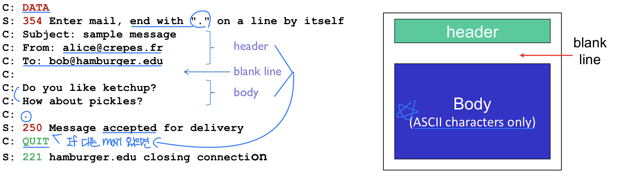 - 메시지 구문(Syntax): 메시지에 어떤 필드가 있고, 필드를 어떻게 구분하는지