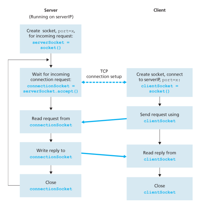서버 프로세스가 실행되면, 클라이언트가 서버의 **환영 소켓(welcome socket)**에 TCP 연결을 시도한다. 핸드셰이킹이 완료되면 서버는 해당 클라이언트에게 지정되는 **연결 소켓(connection socket)**을 생성한다. 클라이언트의 소켓과 서버의 연결 소켓은 마치 파이프처럼 직접 연결된다.