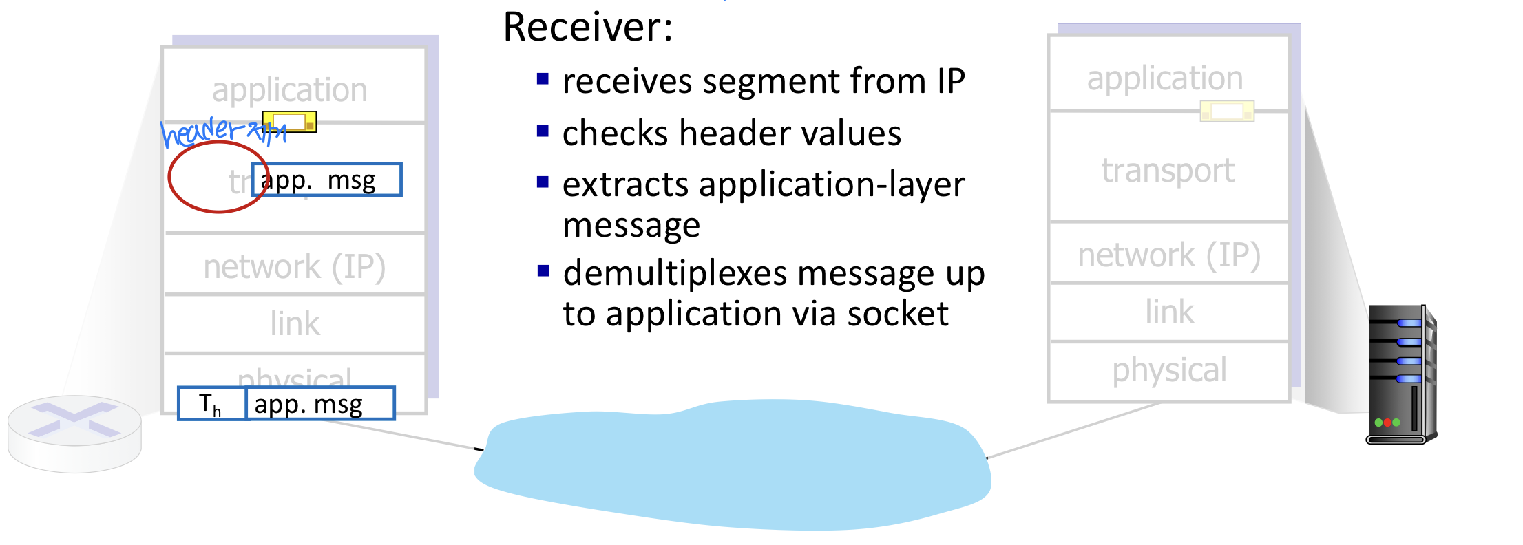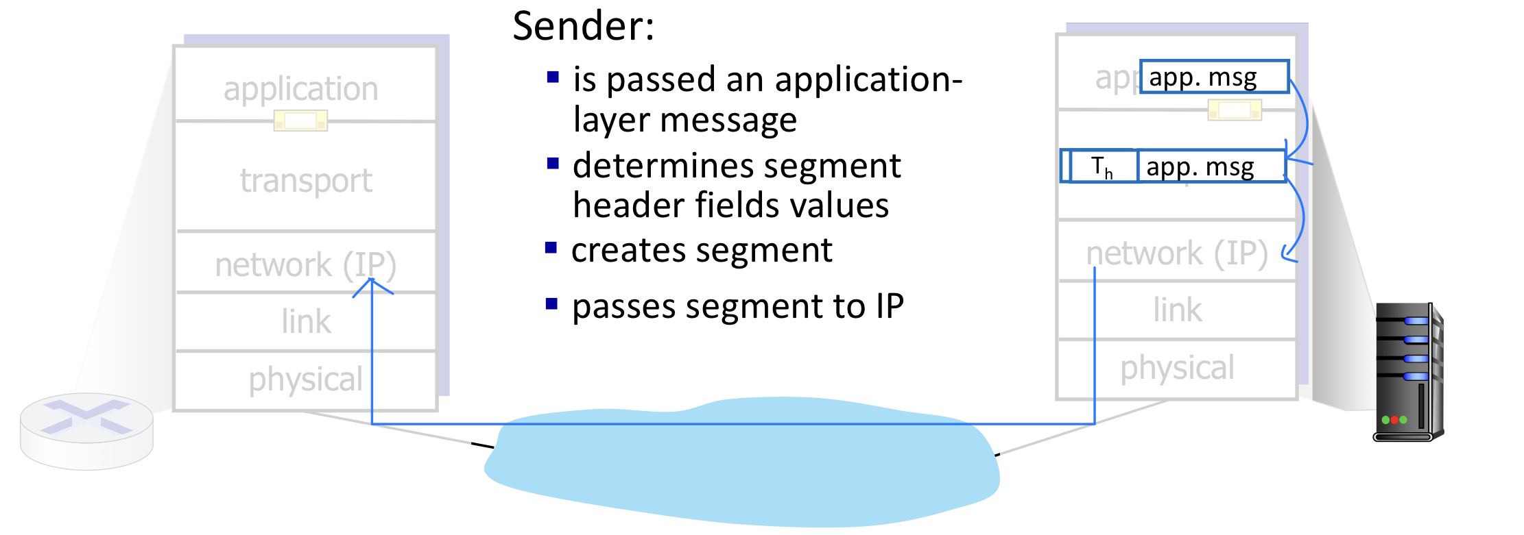- 송신 측(Sender): 애플리케이션 메시지를 **세그먼트(Segment)**로 분할하여 네트워크 계층으로 전달한다.