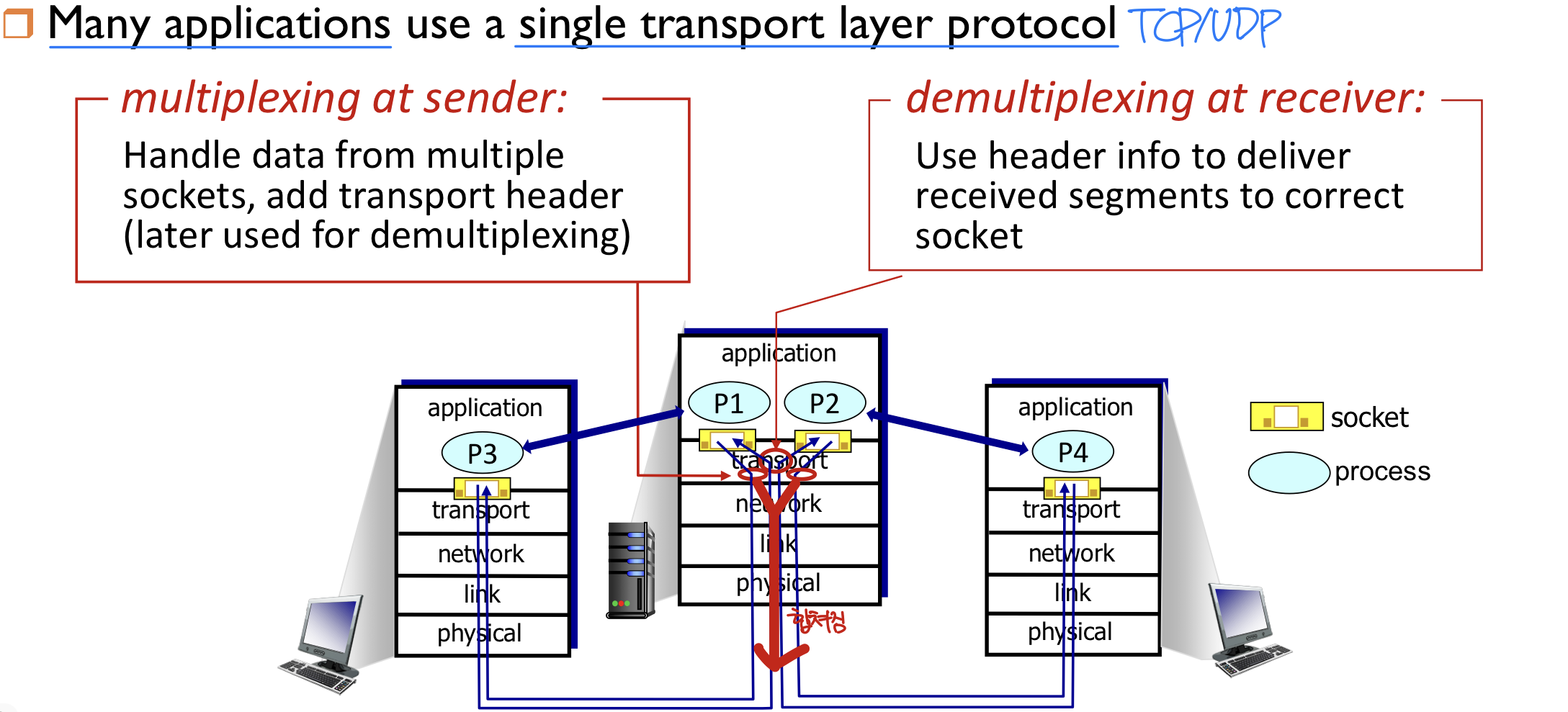 하나의 호스트에서 여러 프로세스가 동시에 실행될 수 있으므로, 전송 계층은 네트워크 계층 서비스에 의존하면서도 이를 **확장(enhance)**하는 역할을 한다.
