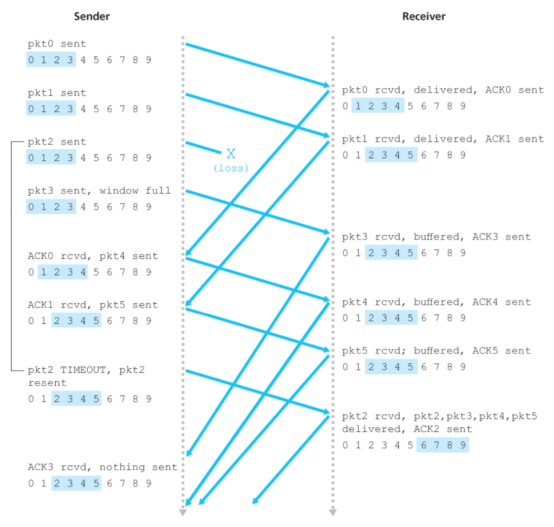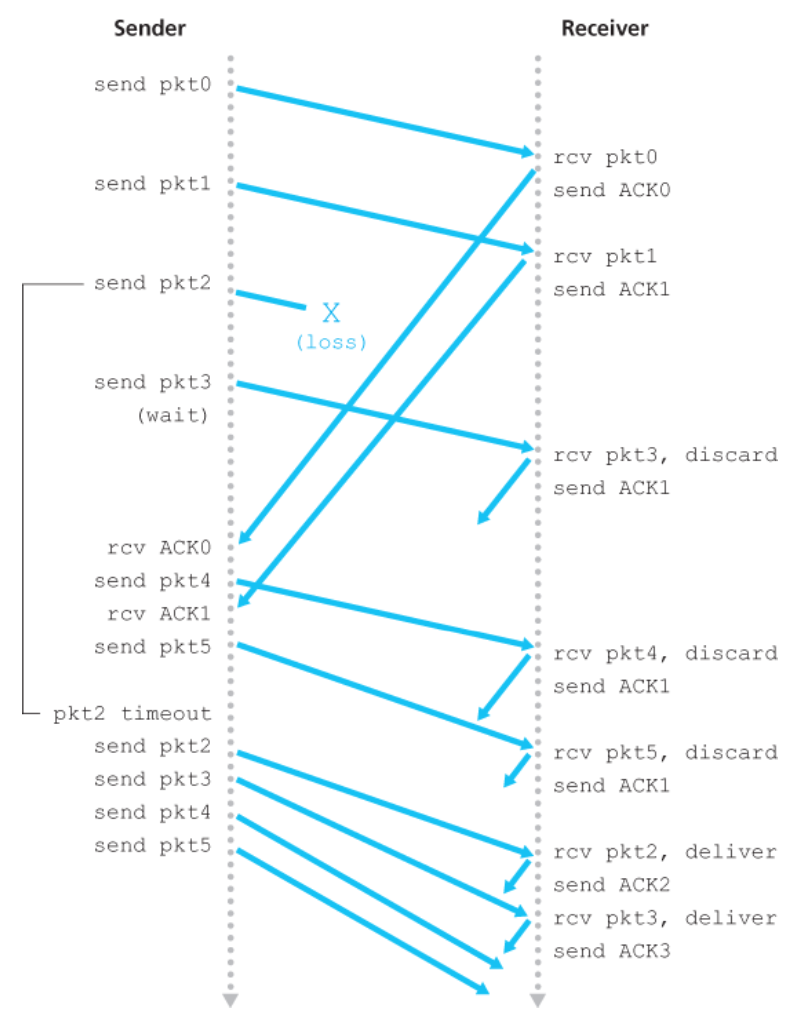 - 신뢰적, 순서 보장 전달(Reliable, in-order delivery)