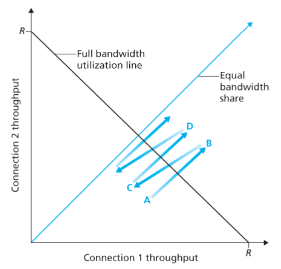 - 만약 TCP가 두 연결 사이에서 링크 대역폭을 똑같이 공유한다면,