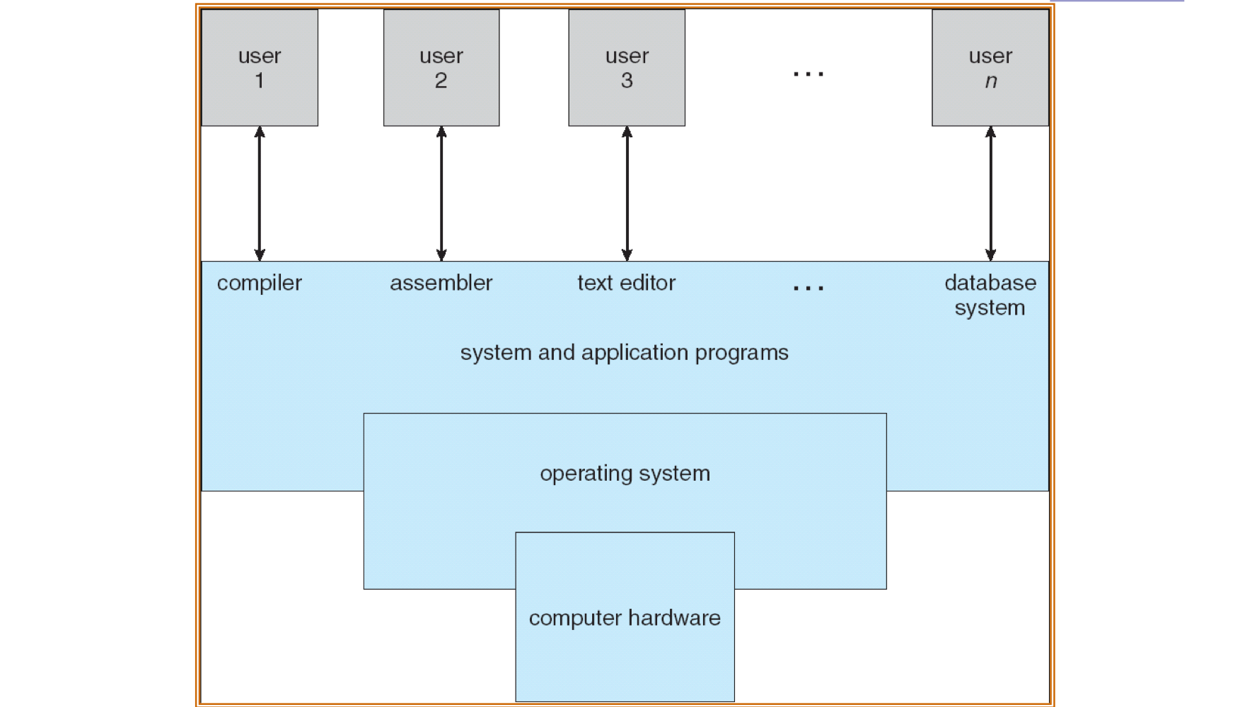 - 응용 프로그램(Application Programs): 시스템 자원을 활용하여 사용자의 문제를 해결하는 방법을 정의한다 (워드 프로세서, 컴파일러, 웹 브라우저, 데이터베이스, 비디오 게임 등)