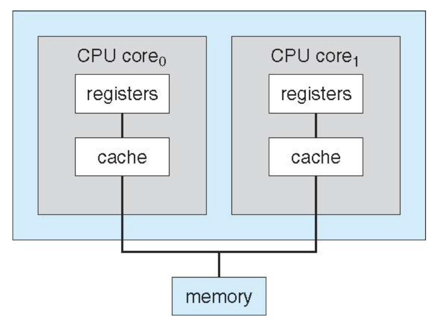 일반적으로 멀티코어 시스템도 이 범주에 포함된다. 멀티코어는 칩은 하나인데 코어가 여러 개인 구조로, 코어들이 캐시 메모리를 공유할 수 있다.
