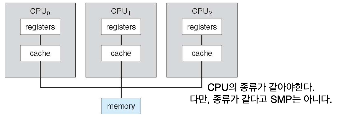 - 대칭형 멀티프로세싱(SMP, Symmetric Multiprocessing): 모든 프로세서가 동등(peer)한 관계