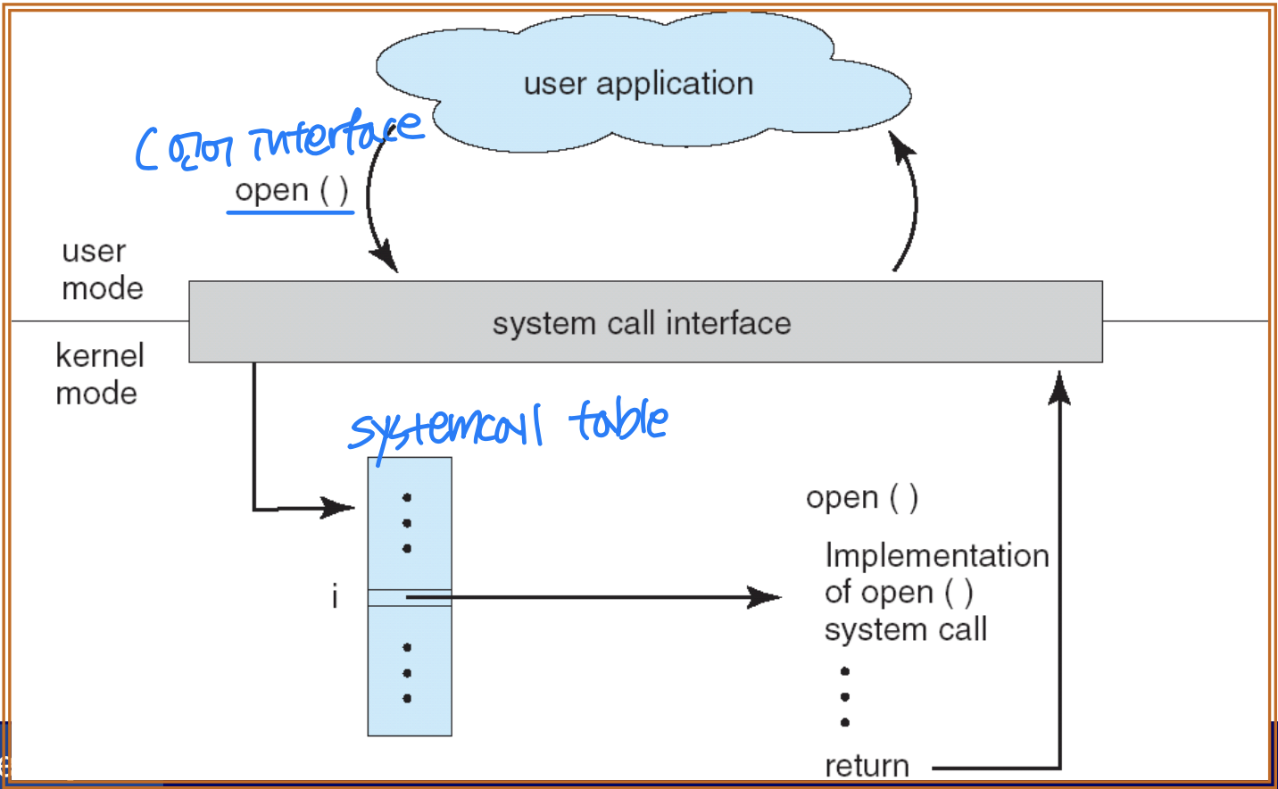 시스템 콜 인터페이스(System-Call Interface) 는 프로그래밍 언어의 런타임 지원 시스템과 OS 시스템 콜 사이의 연결 고리다. glibc(Linux)나 MS libc(Windows)가 이 역할을 담당한다.