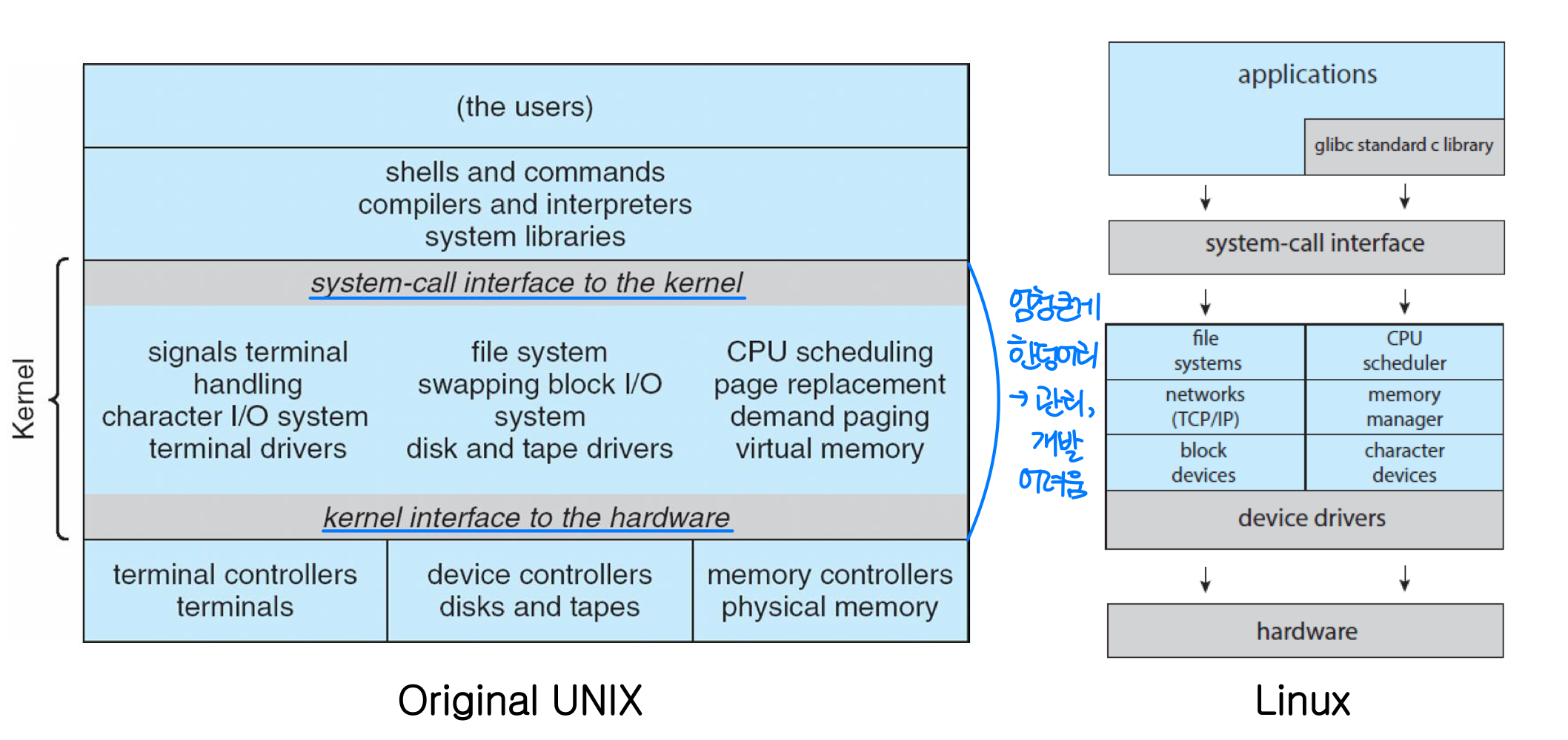 - 초기 UNIX (1973): 하드웨어 기능에 제한되었고, 시스템 프로그램으로 셸, 컴파일러, 인터프리터, 시스템 라이브러리 등을 제공