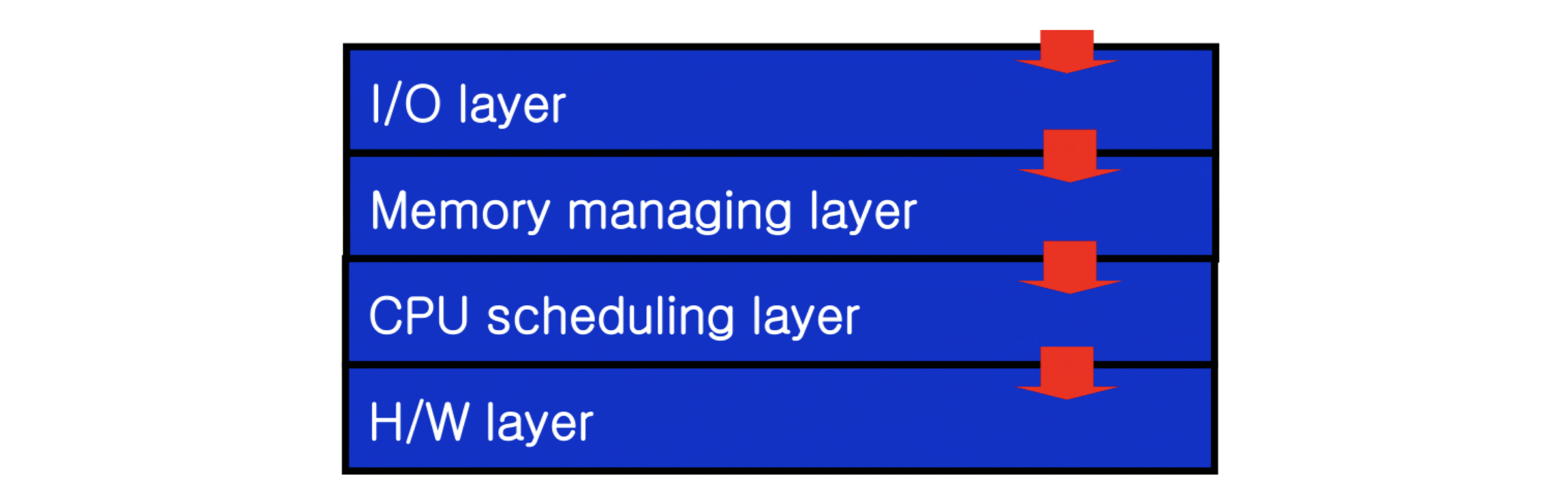 운영체제를 여러 계층(Layer) 으로 구성하는 방식이다. 각 계층은 추상 객체와 연산을 구현하며, 하위 계층의 함수/서비스만을 사용한다. 상위 계층은 하위 계층을 호출하고, 하위 계층은 상위 계층에 의해 호출된다.