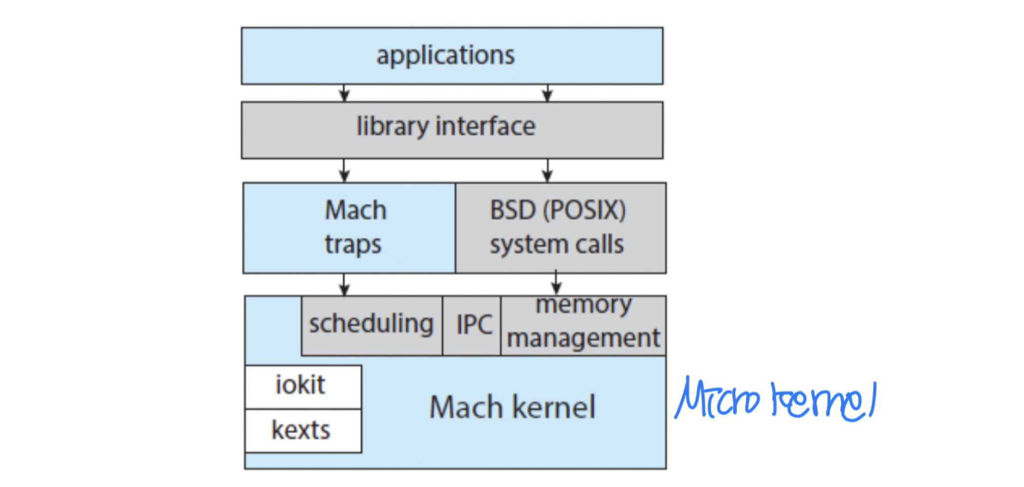- Apple macOS X: 계층형 구조 + Aqua UI + Cocoa 프로그래밍 환경. 커널은 Mach 마이크로커널과 BSD UNIX로 구성되며, I/O Kit과 동적 적재 모듈(커널 익스텐션)을 포함