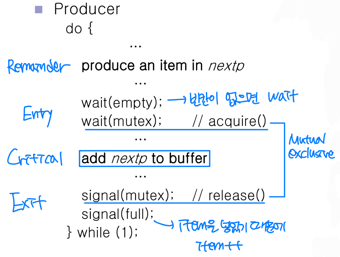 mutex는 버퍼 접근에 대한 상호 배제(Mutual Exclusion) 를 보장하고, empty와 full은 각각 빈 슬롯과 채워진 슬롯의 수를 추적하여 생산자와 소비자의 동기화를 담당한다.