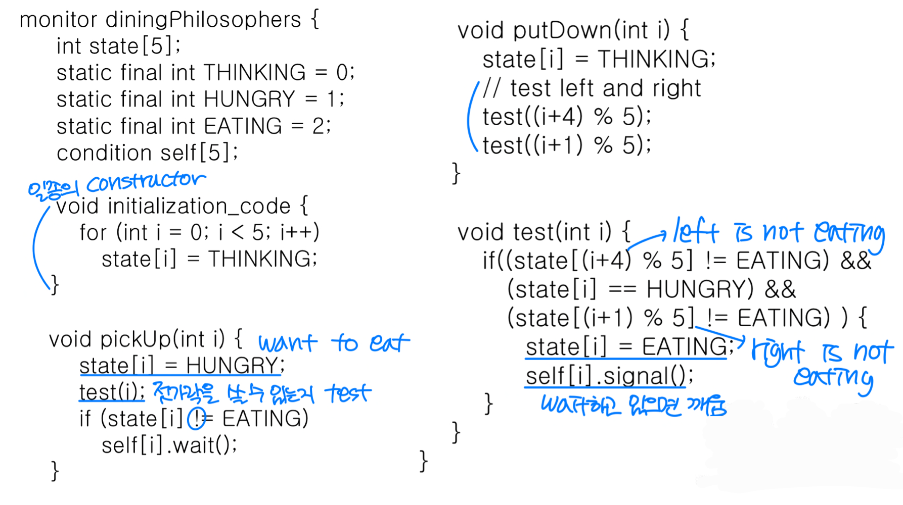 condition self[5]: 각 철학자의 대기 조건 변수 (wait,signal사용)