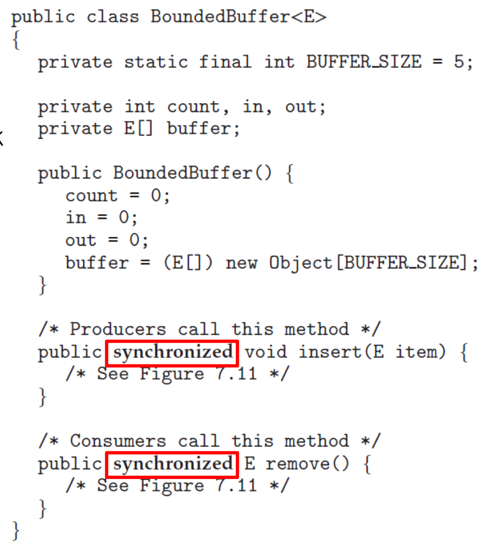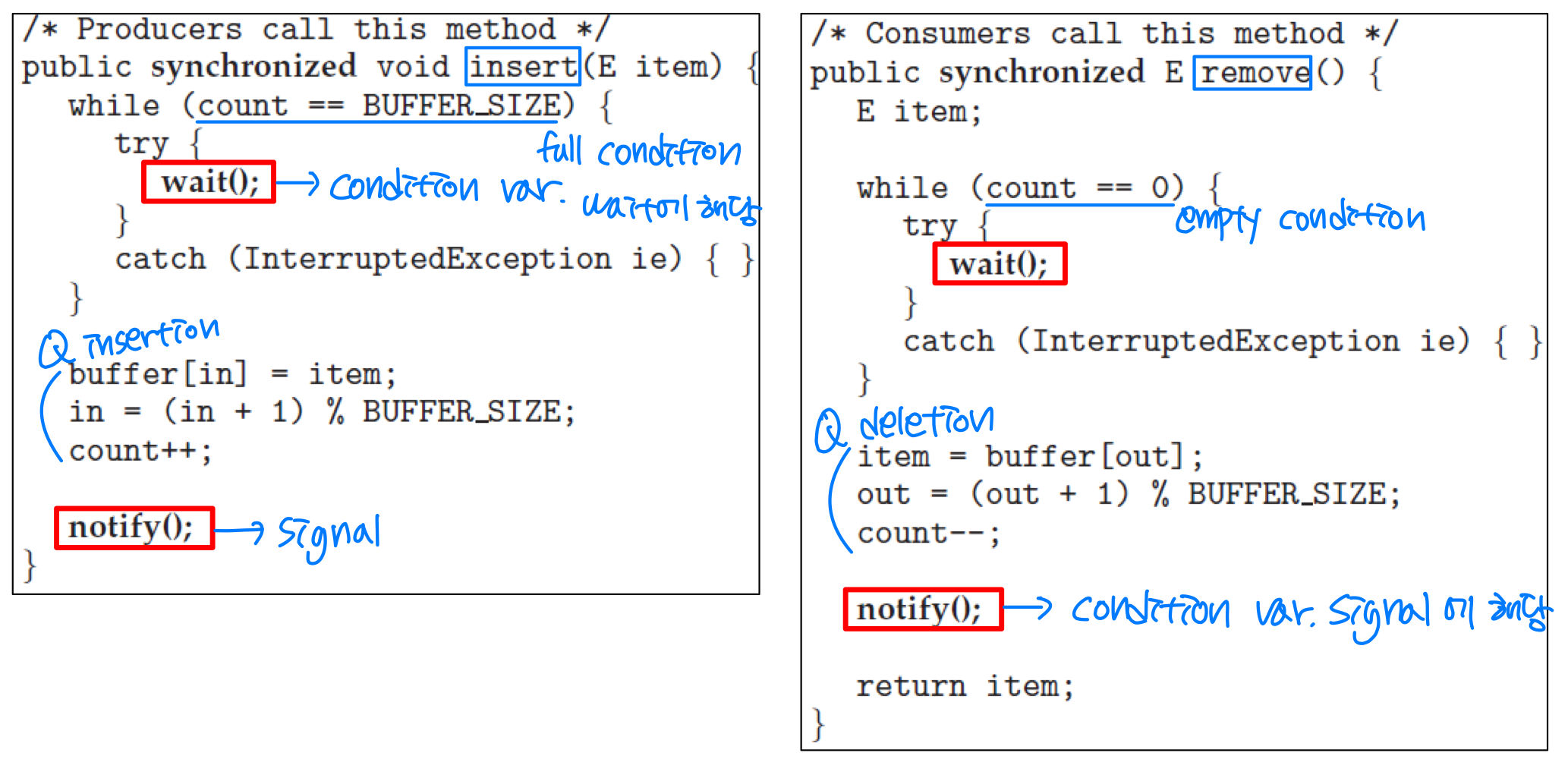 락을 보유한 스레드가 계속 진행할 수 없을 때(예: 버퍼가 가득 찬 상태에서 insert() 호출), wait() 을 호출한다.