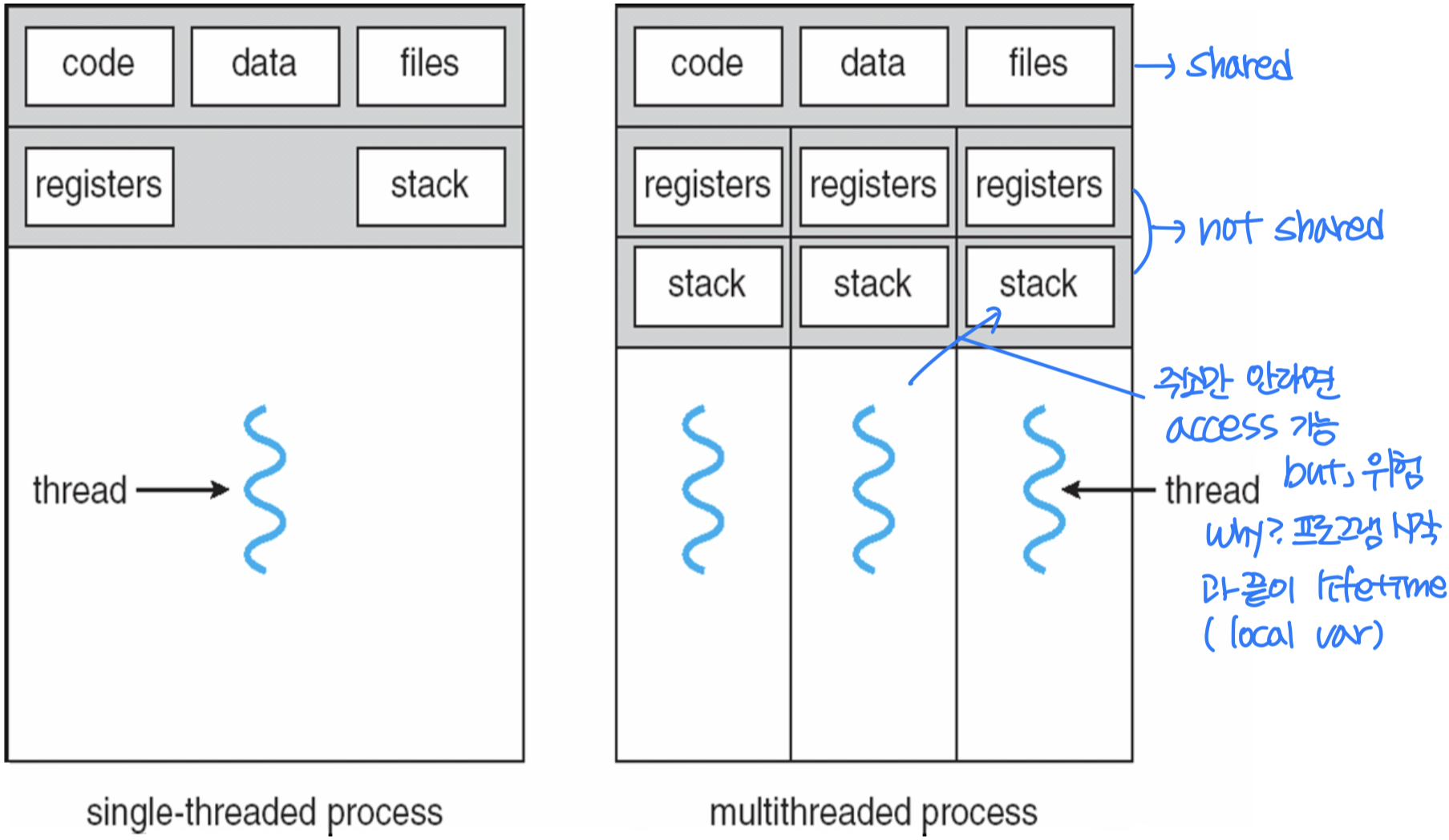 이 중 스택은 스레드마다 독립적으로 가지며, 나머지 코드/데이터/파일 등의 자원은 같은 프로세스 내 스레드끼리 공유한다.