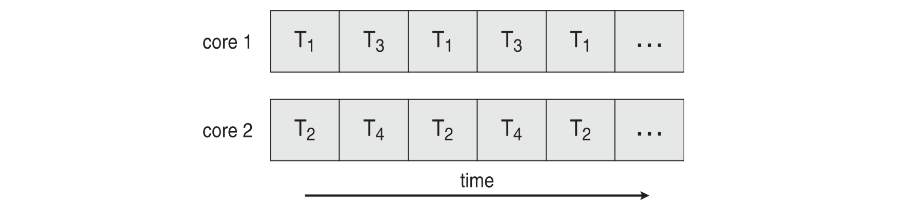 동시성(Concurrency) 은 여러 작업이 진행 중인 상태를 의미한다. 싱글 코어 환경에서도 스케줄러가 타임 셰어링을 통해 동시성을 제공할 수 있다. 실제로 동시에 실행되는 것이 아니라 빠르게 번갈아 실행하는 것이다.