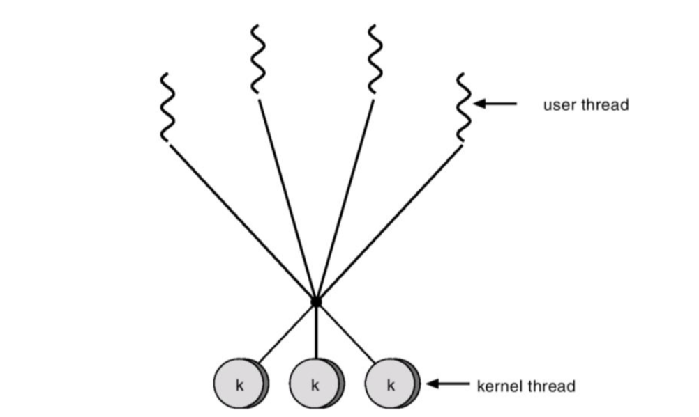 여러 사용자 스레드가 같거나 더 적은 수의 커널 스레드에 매핑된다. 다대일 모델과 일대일 모델의 절충안(Compromise) 이다.