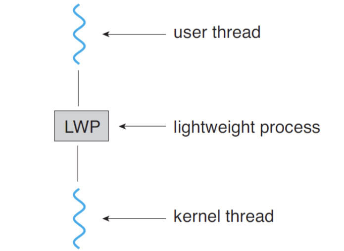 이 모델들에서 사용자 스레드와 커널 스레드는 LWP(Lightweight Process) 를 통해 연결된다.