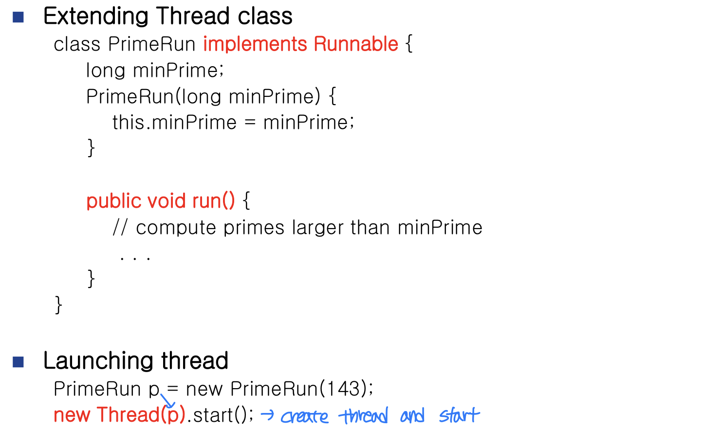 - Runnable 인터페이스를 구현(implements) 하는 방법 - 다중 인터페이스 구현이 가능하므로 더 유연하다