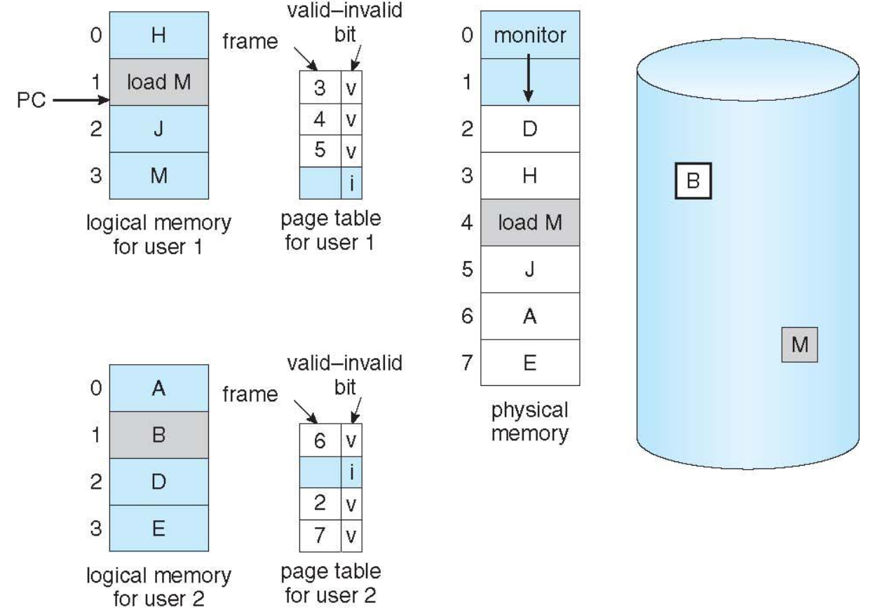 페이지는 프로그램 실행 중 요구될 때만 적재된다. 이를 위해서는 해당 페이지가 메모리에 있는지 디스크에 있는지 구분하는 하드웨어 지원이 필요하다.