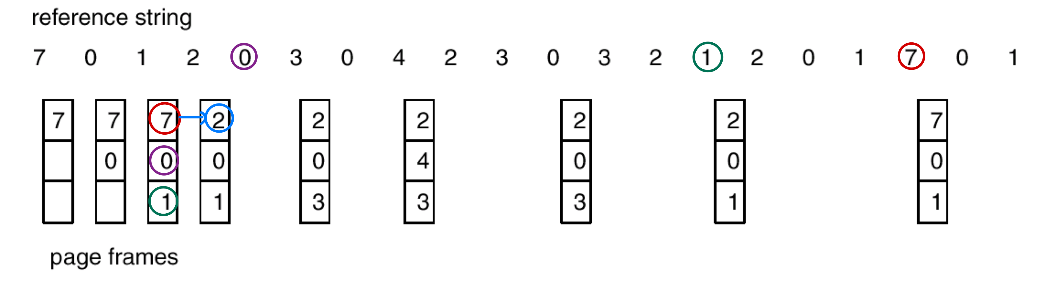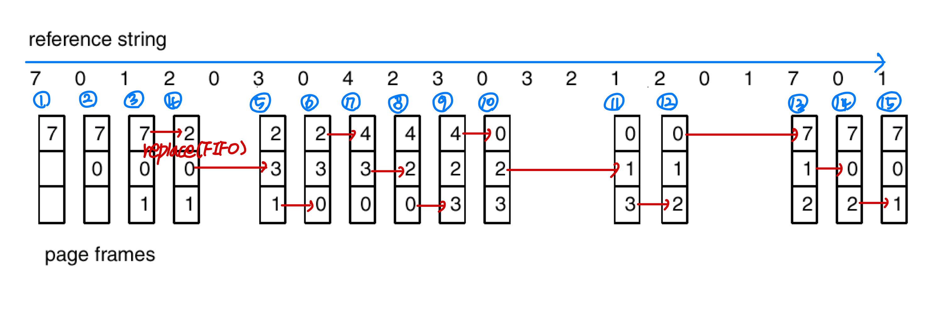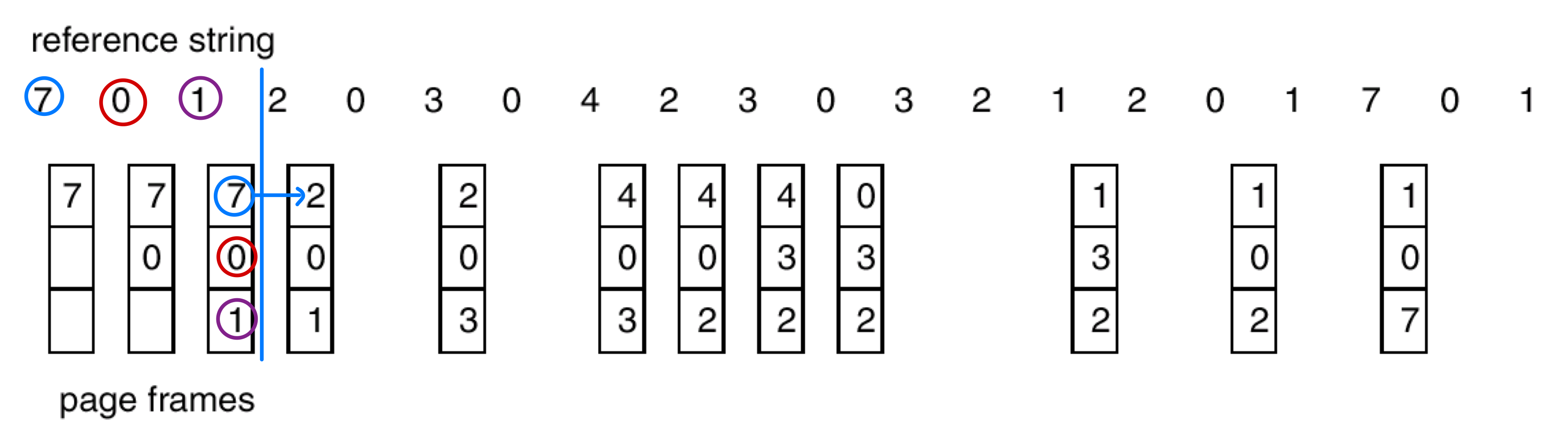 FIFO(First-In, First-Out): 가장 오래된 페이지를 교체 대상으로 선택한다. 구현이 간단하지만 항상 좋은 성능을 보이지는 않는다.