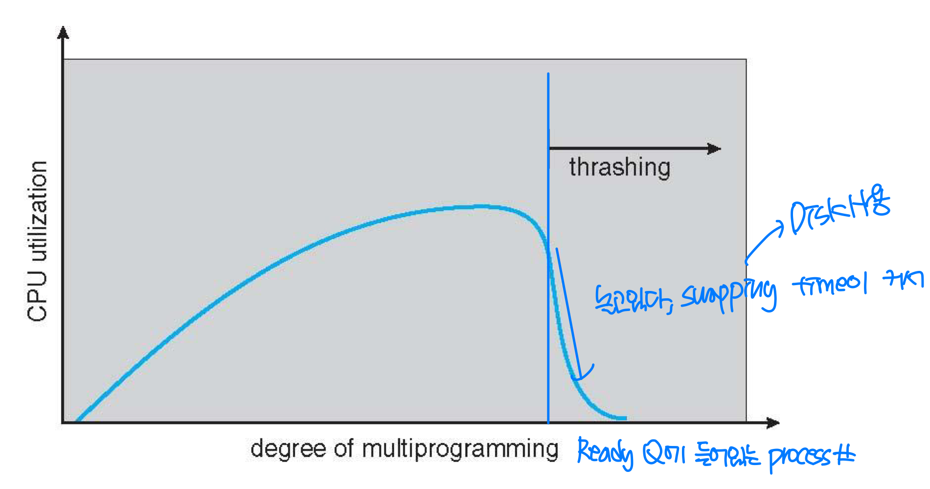 스래싱이 시작되면 CPU 이용률이 급격히 떨어진다. 이때 다중 프로그래밍 정도(degree of multiprogramming)를 줄여야 한다.