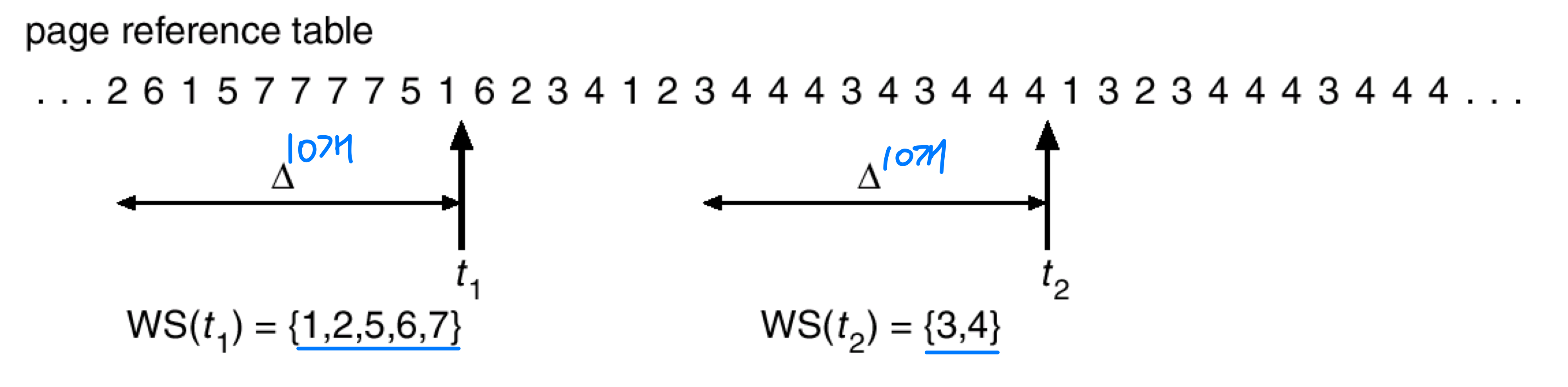 워킹셋(Working Set) 은 가장 최근 개의 페이지 참조에 포함된 페이지들의 집합이다. 를 워킹셋 윈도우(Working-Set Window) 라 한다.
