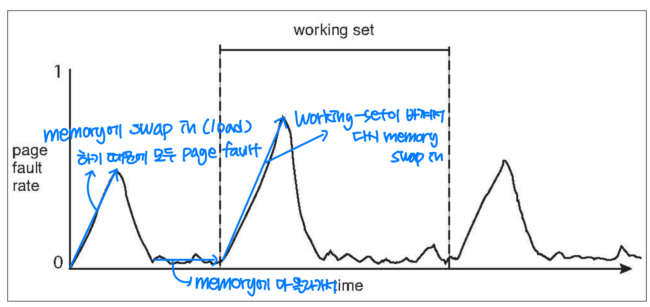 프로세스의 워킹셋과 페이지 폴트율은 직접적인 상관관계가 있다. 워킹셋은 시간에 따라 변하며, 페이지 폴트율도 시간에 따라 봉우리(peak)와 골짜기(valley)를 그린다.