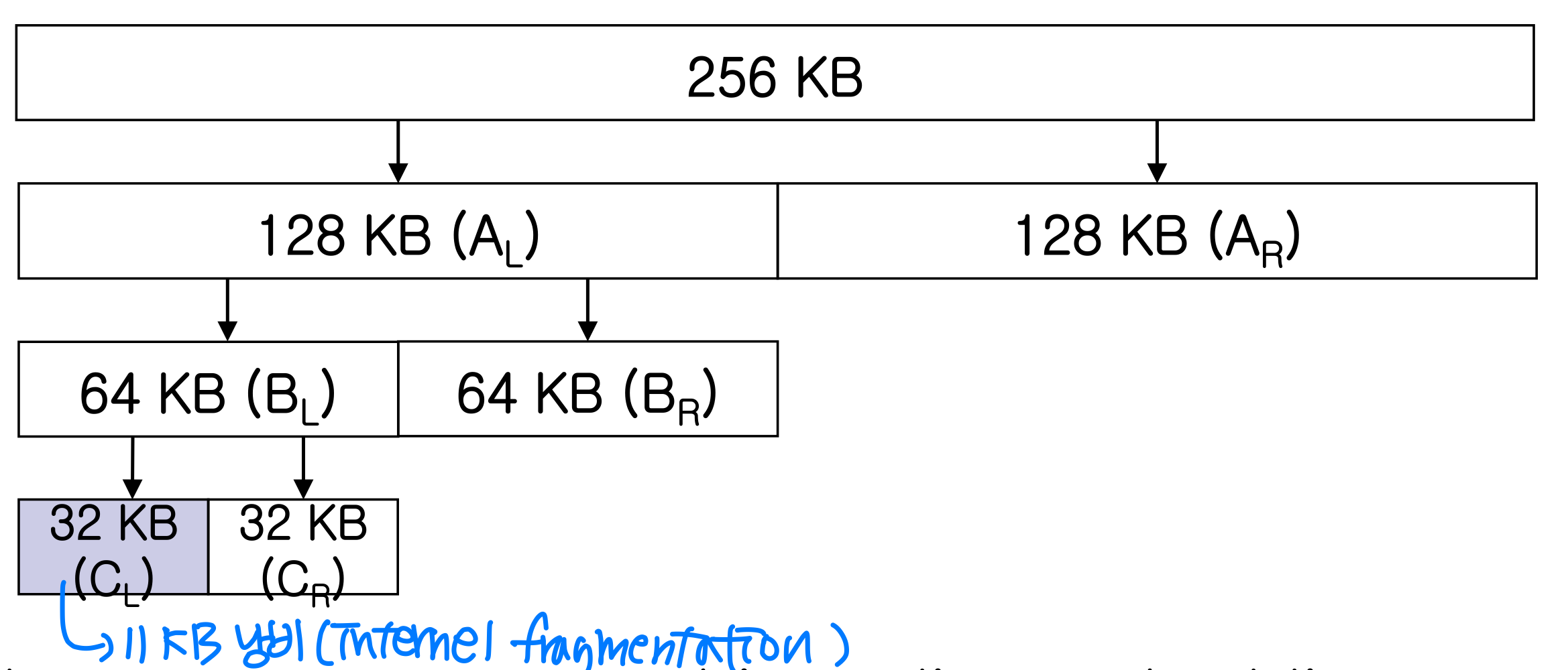 - 단점: 내부 단편화가 발생한다 (21KB 요청에 32KB 할당)