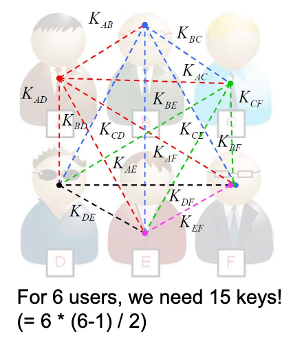 대칭키 암호화는 두 당사자 간에 비밀 키를 공유해야 한다. n명의 사용자가 서로 통신하려면 n(n-1)/2개의 키가 필요하다.