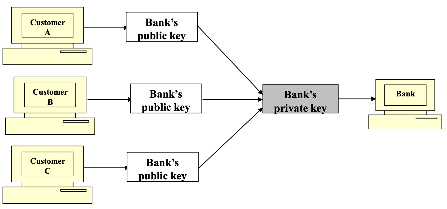 - 고객들은 은행의 공개 키로 메시지를 암호화