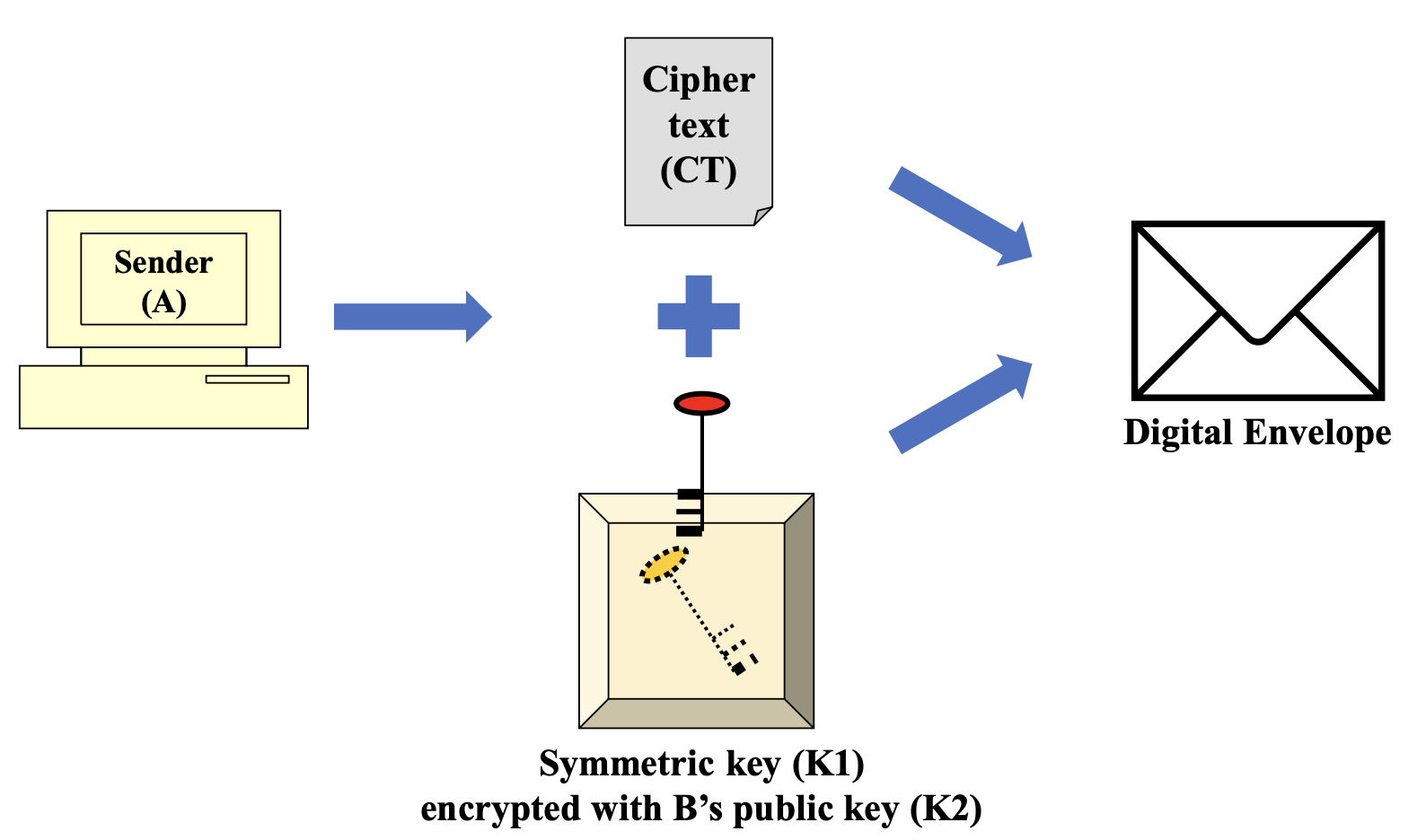 - 암호화된 메시지와 암호화된 키를 묶어서 Digital Envelope 생성