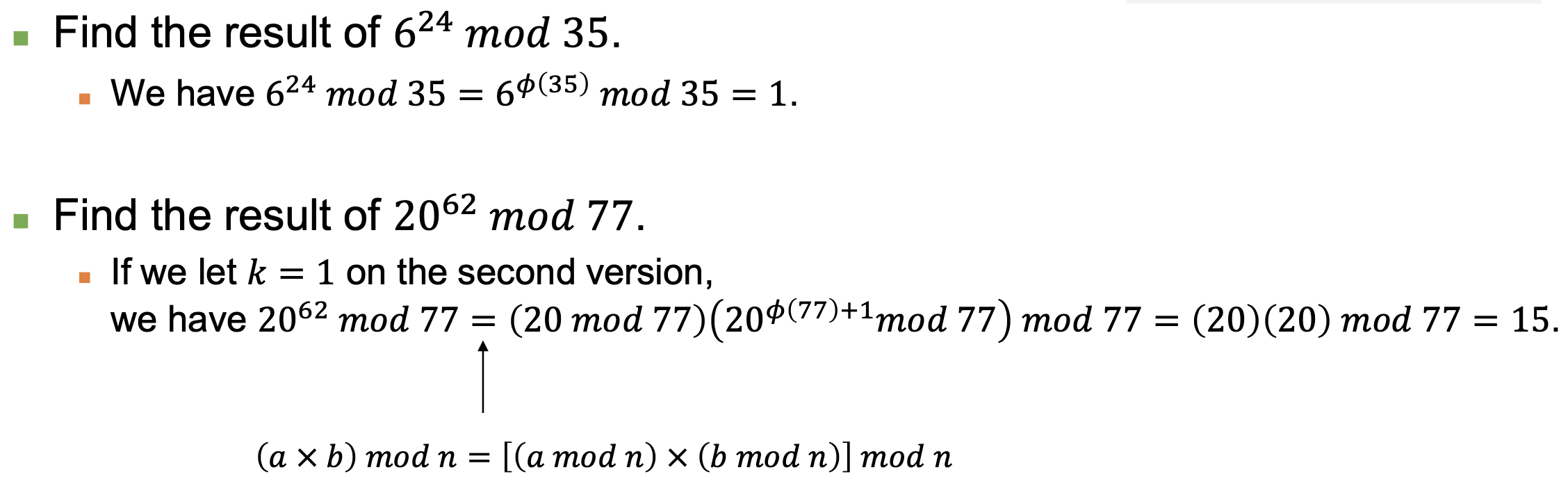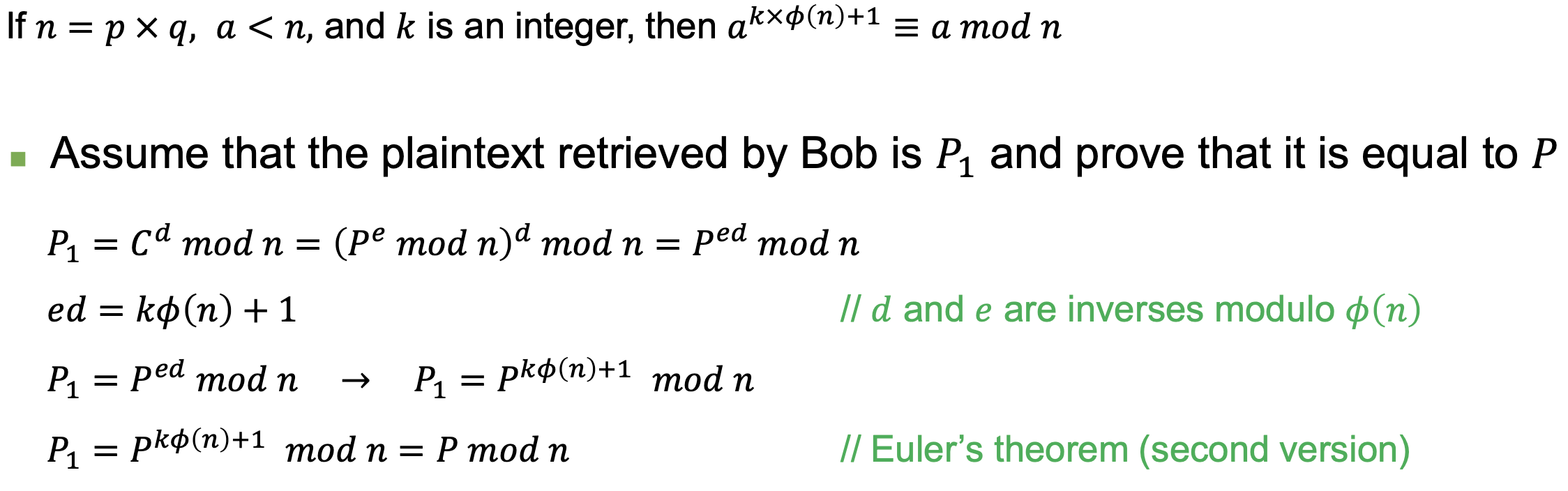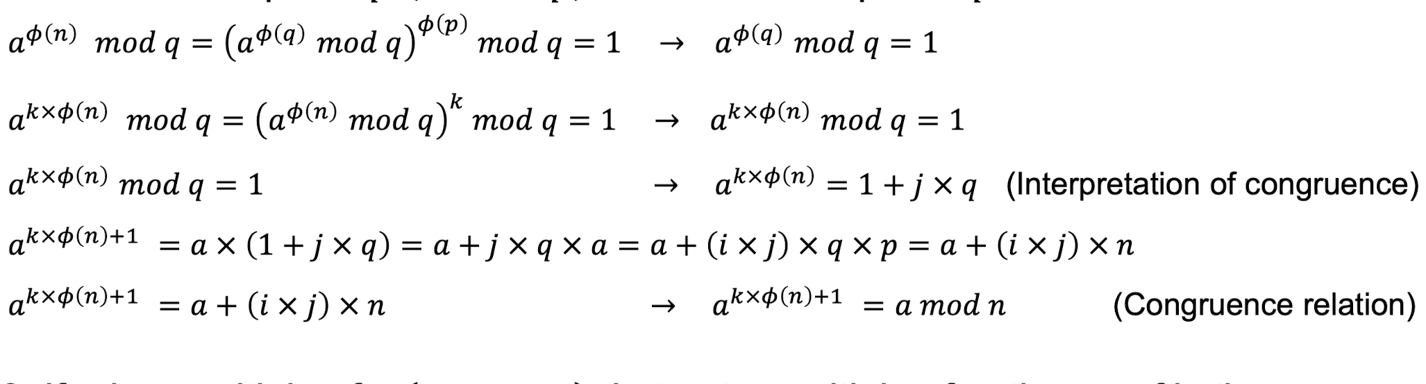 - 두 번째 버전 (RSA에서 사용): n = p × q, a < n, k가 정수일 때 a^(k×φ(n)+1) ≡ a (mod n)