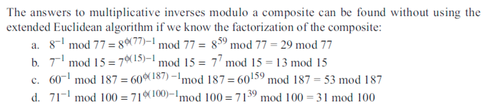 a⁻¹ mod n = a^(φ(n)−1) mod n