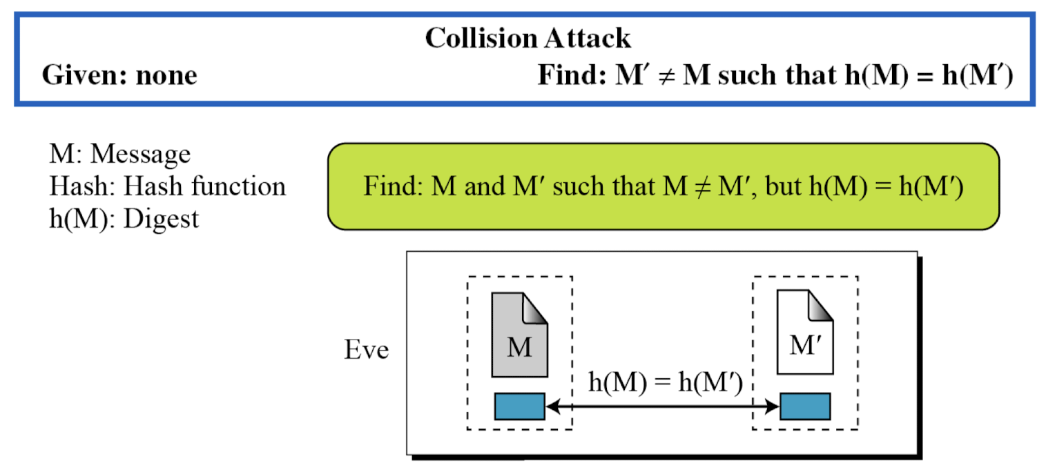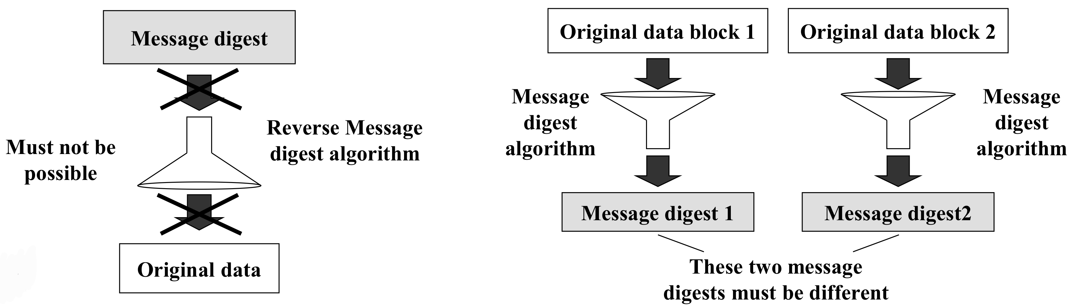 - 서로 다른 두 메시지의 다이제스트는 서로 달라야 한다