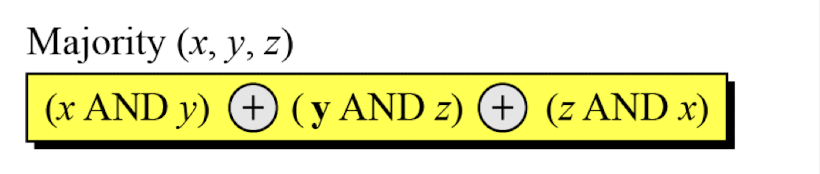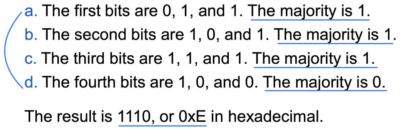 버퍼 A, B, C에 Majority 함수를 적용한다. 최상위 16진수가 각각 0x7, 0xA, 0xE일 때 결과의 최상위 숫자는?