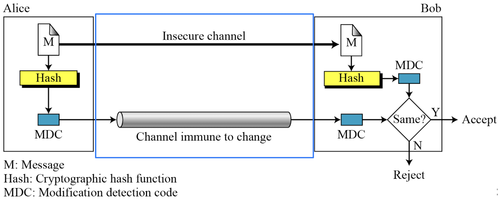 Alice가 Bob에게 메시지를 보낼 때, MDC를 생성하여 메시지와 함께 전송한다. Bob은 메시지에서 새 MDC를 생성하고 수신된 MDC와 비교한다. 동일하면 메시지가 변경되지 않은 것이다.