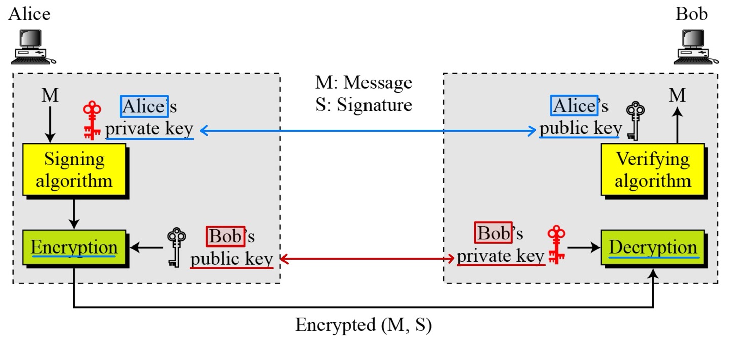 디지털 서명은 발신자 신원 검증, 메시지 무결성, 부인 방지를 직접 제공한다. 메시지 기밀성을 위해서는 여전히 암호화/복호화가 필요하다.