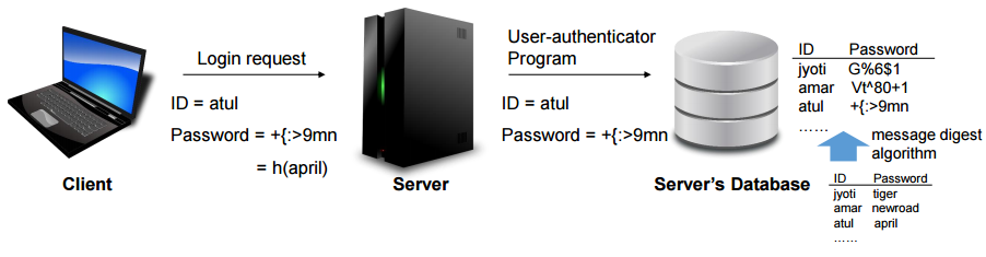 원본 비밀번호를 절대 저장하거나 전송하지 않는 방식이다. 대신 비밀번호의 **해시값(Message Digest)**을 데이터베이스에 저장하고, 인증 시에도 해시값을 비교한다.